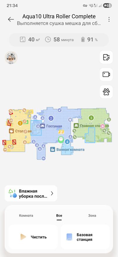 Как итог — Dreame Aqua 10 Ultra Roller Complete в моих условиях отработал хорошо: сухая и влажная уборка подряд без ручных вмешательств, карта собирается быстро, кромки и углы добирает, под низкой мебелью проходит, ножки стола обходит так, как я и хотел. После сухого круга выгружает мусор в мешок, в мойке периодически уходит на базу освежить вал, пополнить резервуар с водой и возвращается в ту же точку. На цикл по двушке хватало: сухая заняла 51 минуту, влажная 72, к финалу осталось порядка трети заряда.