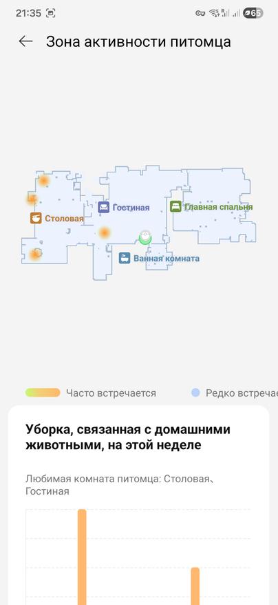 Автораспознавание пятен смотрел на специально подготовленном полу. В прихожей оставил полосы от влажных следов и отметил пару засохших пятен на кухне. В сухой части он прошел как обычно, а вот в мойке местами останавливался и делал дополнительный проход по локальному участку. На карте эти зоны подсвечивались как загрязнения, отдельно видно, где система маркирует высохшее, где свежие следы. Визуально лишних кругов по чистому не наматывал, именно добирал то, что нужно. Для квартиры это удобный сценарий: не приходится вручную ставить точку на карту, робот сам нашел и чуть дольше поработал именно там, где было грязнее.