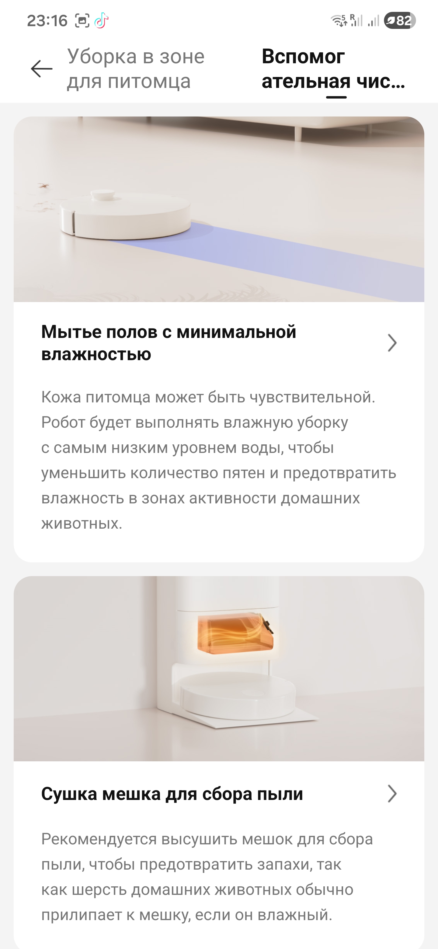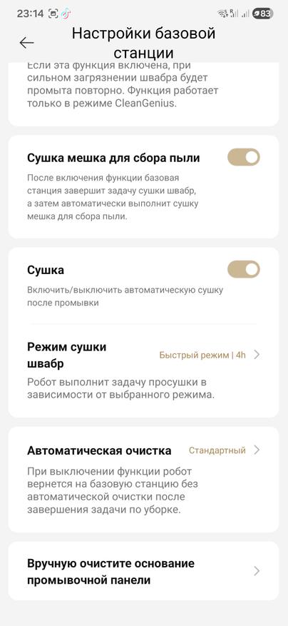 Сушку пылевого контейнера проверил отдельным заходом. После выгрузки мусора в мешок включил в настройках сушку, оставил робота на базе и прислушался. Станция не ревет, идет ровный теплый поток, через приложение видно статус и таймер. По завершении прилетает уведомление, контейнер внутри сухой, запаха сырости нет. Если часто запускаешь влажную следом за сухой и контейнер ловит влагу, эта функция выручает: не надо вынимать и распихивать все по батареям, робот сам просушит свой «бардачок».