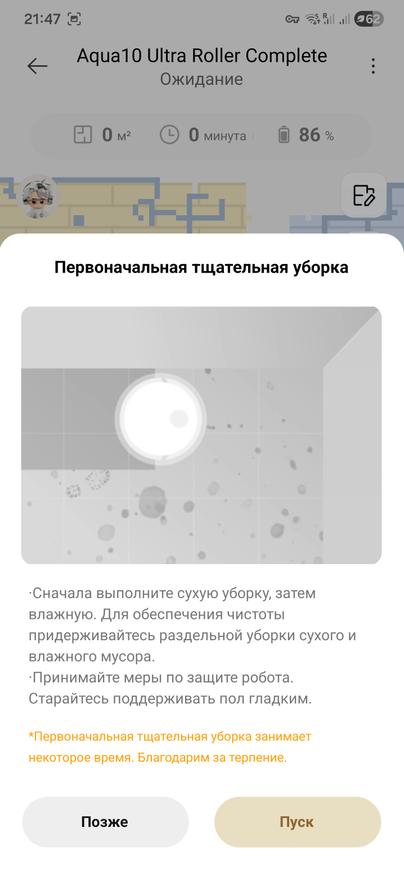 Начал по классике: сухая уборка во всей двушке, примерно 65 м². Ковров нет, собака есть, подростки тоже. Перед стартом устроили редкий праздник порядка: с пола убрали провода, носки, все, что обычно живет под столом. Робот проснулся, подмигнул и быстро накидал карту. Пошел по периметрам.