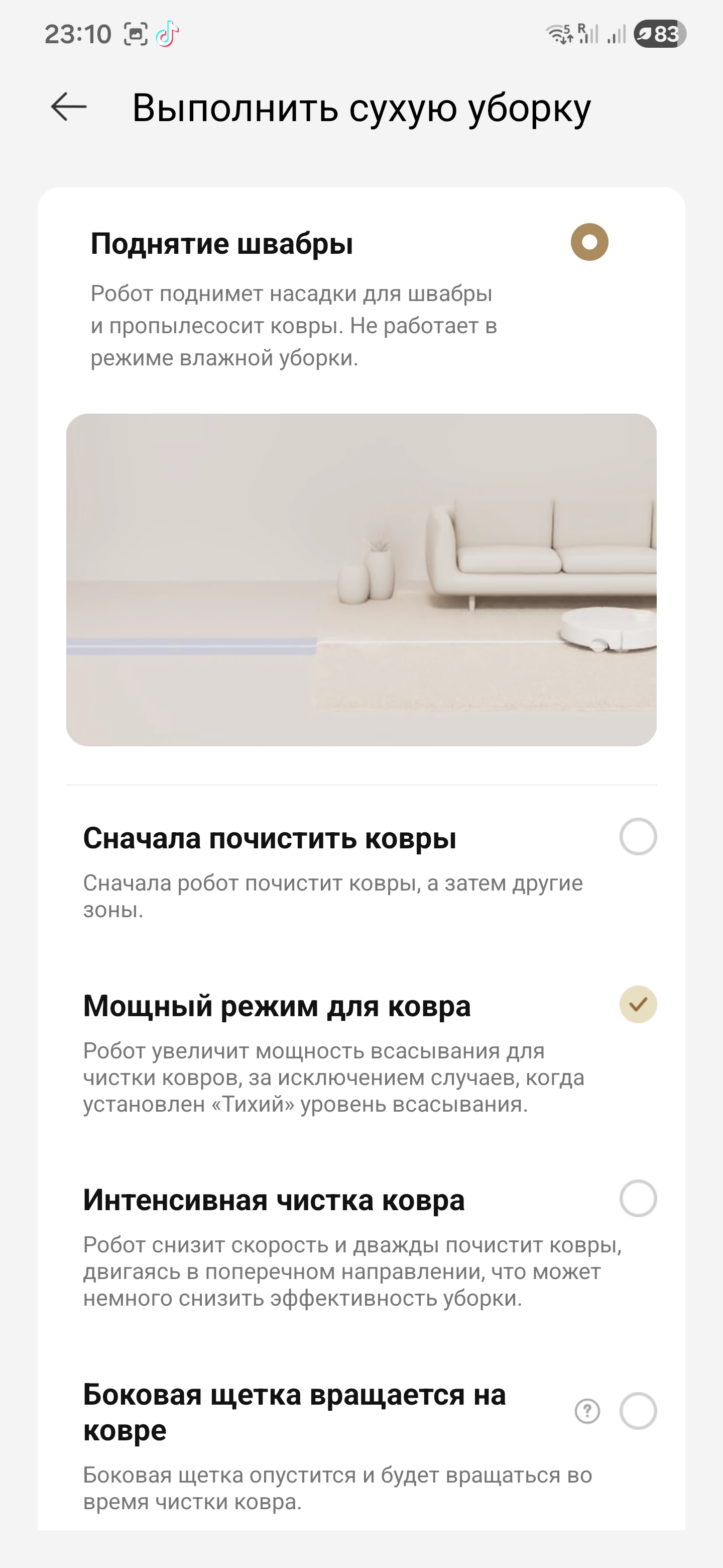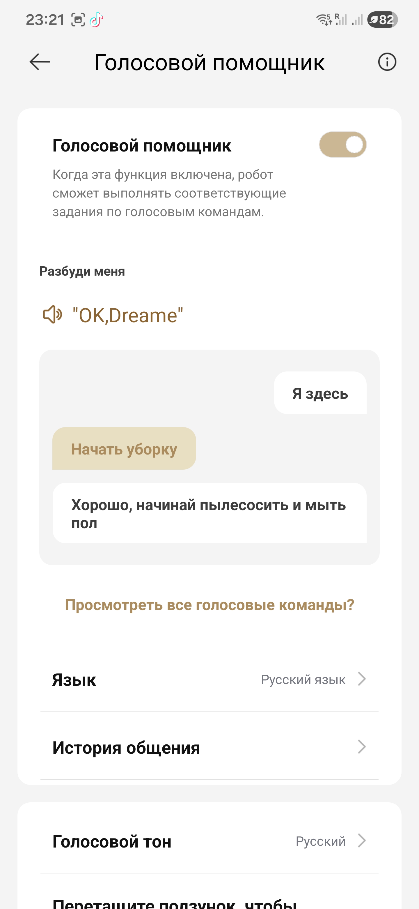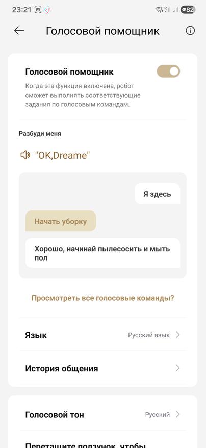 И это лишь одна из голосовых команд. Помимо «Окей, Дрими, убери здесь» есть стандартные «начни уборку», «поставь на паузу», «вернись на базу», можно менять режимы, звать его в комнату по названию и запускать точечную уборку. По сути, если под рукой нет телефона, голос закрывает почти все бытовые сценарии.
