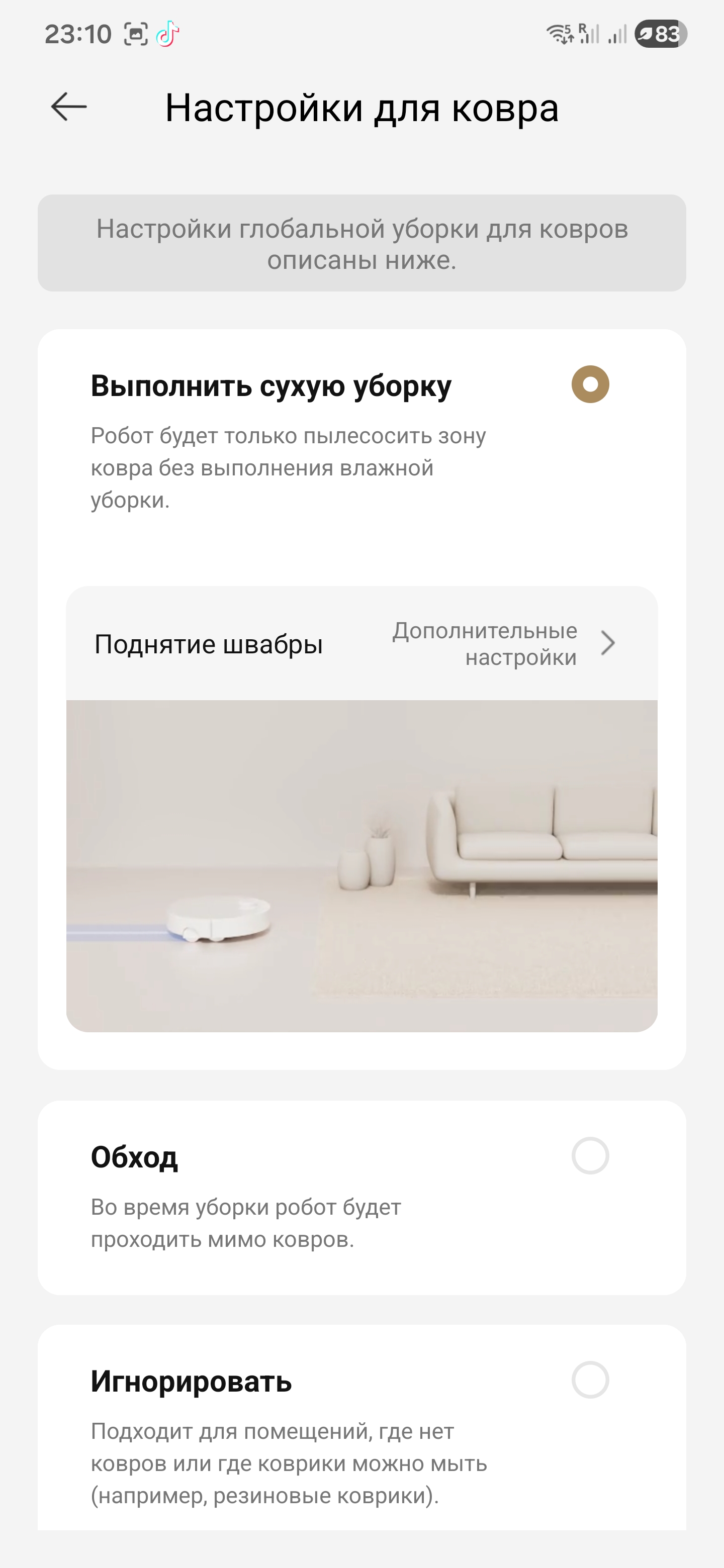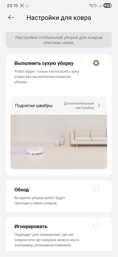 Еще несколько слов о коврах. Я постелил узкую ковровую дорожку и зафиксировал ее малярным скотчем, чтобы не уезжала. Робот заехал на ворс, тут же поднял центральный щеточный блок и боковую щетку, съехал обратно на твердый пол и опустил узлы, продолжил обычную уборку. Поведение можно тонко настроить в приложении под конкретную ситуацию. Есть вариант обходить ковры во время мойки и вовсе не заезжать на них. Можно выбрать «игнорировать» и тогда цикл пойдет как обычно, включая влажную часть, будто ковров нет. Или оставить «пропуск ковров», когда робот использует их как дорожки для перемещения, но сами ковры не чистит и не моет. Для квартиры с разными покрытиями это удобно.