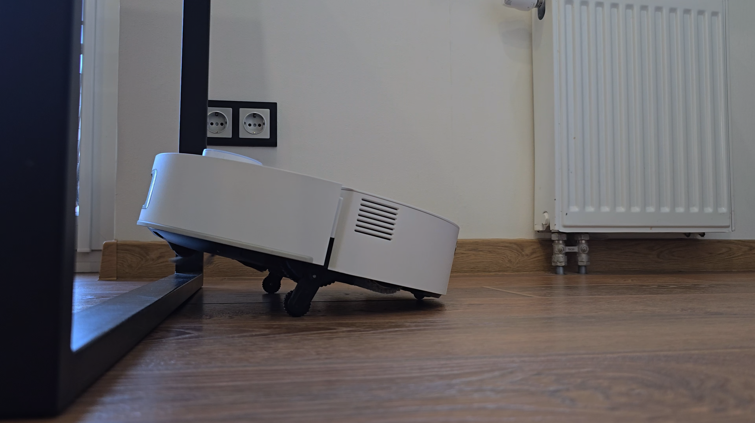 Я вначале переживал, что этот стол с лежачими прямоугольными ножками станет для робота странной ловушкой. Планки низкие, миллиметров двадцать, но длинные, около восьмидесяти. Как раз то, на что техника обычно норовит залезть боком, потом буксует и вертится на одном месте. В настройках сразу включил режим без преодоления порожков, потому что порожков у меня и так нет, а вот эти ножки на полу есть. И, честно, вздохнул с облегчением уже на первом круге. Подъезжает вплотную, останавливается как вкопанный, ни шага вверх, ни попытки перелезть на ребро, просто признает границу и идет дальше.