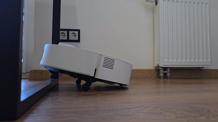 «Синхронное преодоление» выглядит иначе, но по итогу эффект тот же. Подъехал ровно, приподнялся всем корпусом и, как на коротком мостике, прошел через препятствие одним движением. Видно, что логика отличается: меньше маневров, больше прямолинейности. В обоих режимах планка 20х800 мм для него не событие, просто очередная неровность. Но лично мне весь этот героизм ни к чему: ножка — это мебель, а не порог. Когда стоит задача ежедневной уборки, идеальный сценарий — объезд по периметру. Чистая кромка вокруг опоры, ноль риска застрять, и никакой игры в альпинизм посреди кухни.