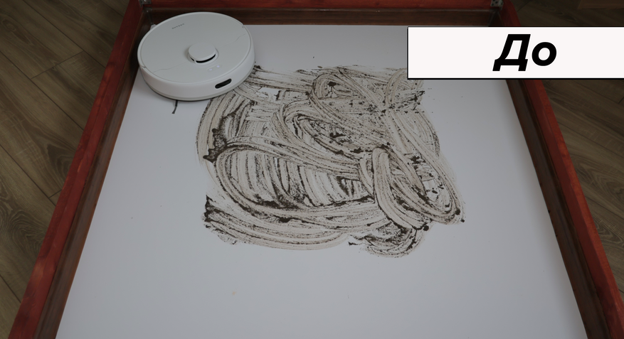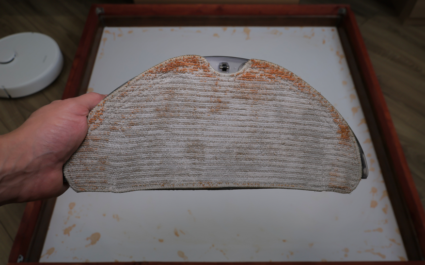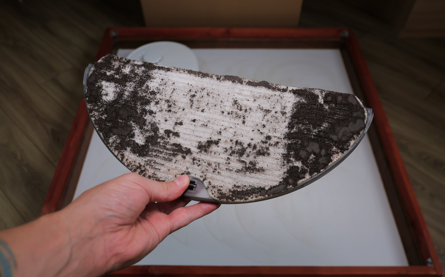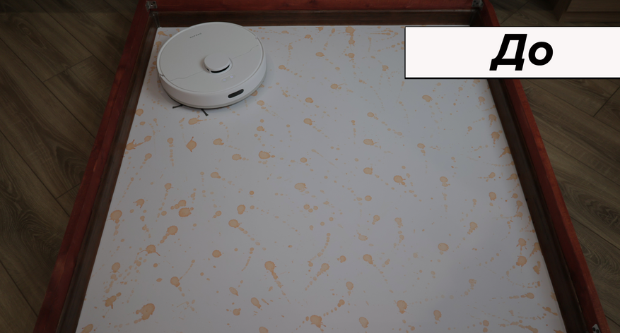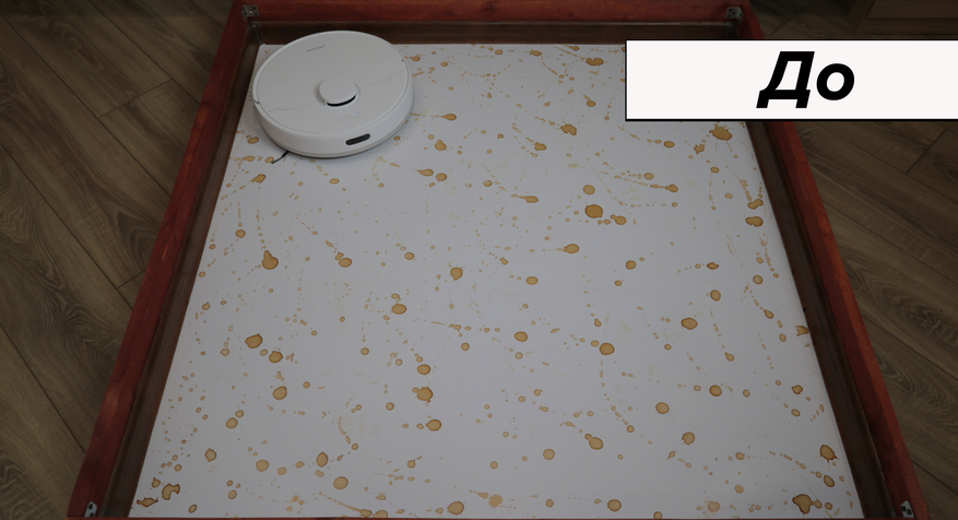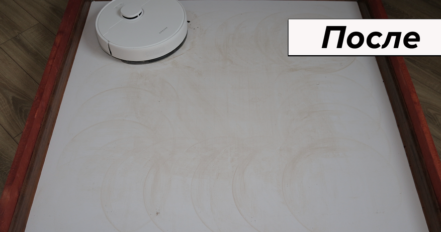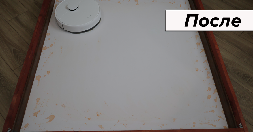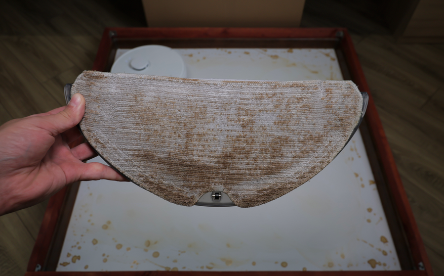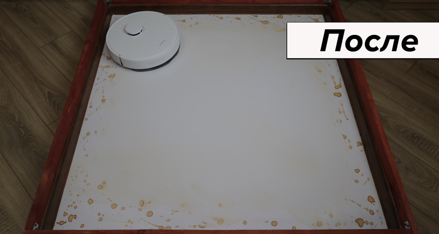 По влажной уборке ситуация противоположная. Вроде бы предусмотрели алгоритм плотными зигзагами, есть салфетка большой площади, автоматическая помпа, — но по факту система работает плохо. Салфетка смачивается слабо и почти не прилегает к полу. Даже на кофейные пятна роботу понадобилось 6 проходов! Для сравнения большинство аналогов справляются с этой задачей за 2-3 прохода.