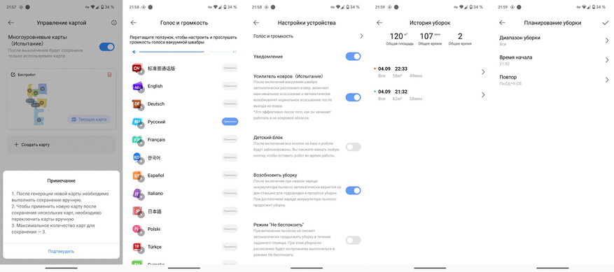 В плане шума никаких инноваций сделано не было. Робот выдаёт стандартные 57-70 дБ. Уборку желательно планировать, когда никого нет дома, особенно при наличии ковров.