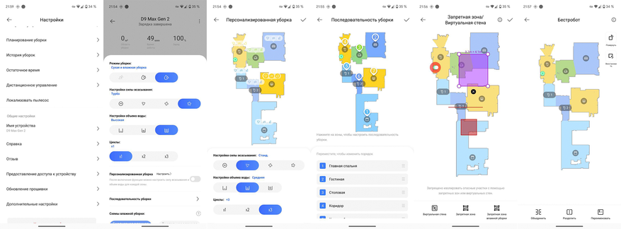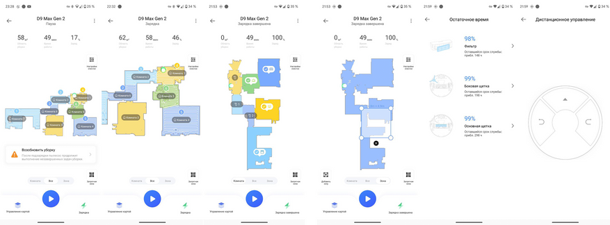 Следует заметить, что Dreame D9 Max Gen2 в процессе зонированной уборки действует по укороченному алгоритму: проходит 1 раз по периметру, затем перекрестными зигзагами, и на этом всё. Второго прохода вдоль бортов, в отличие от большинства аналогов, он не совершает. Но даже с учетом такого алгоритма робот показал выдающиеся результаты.