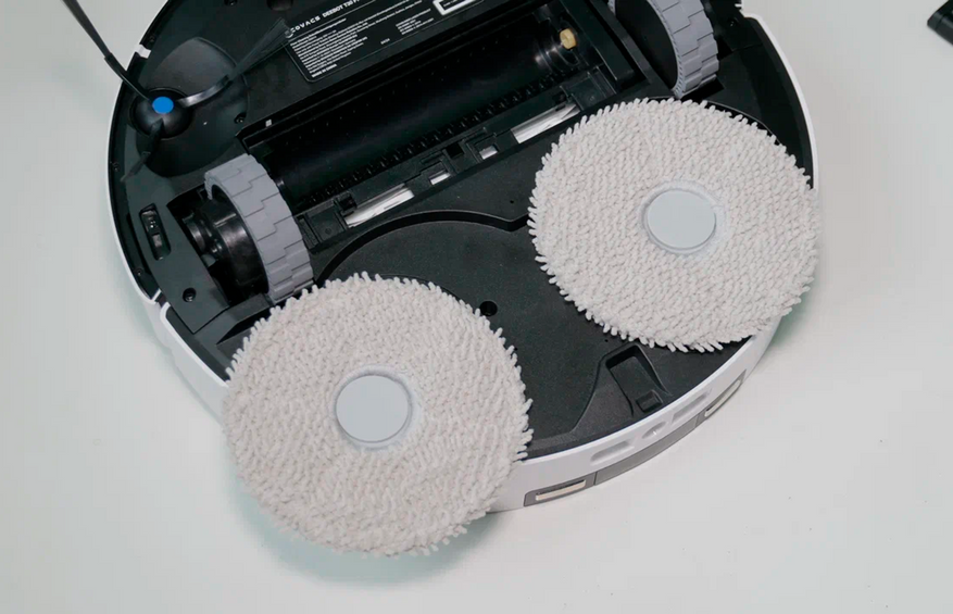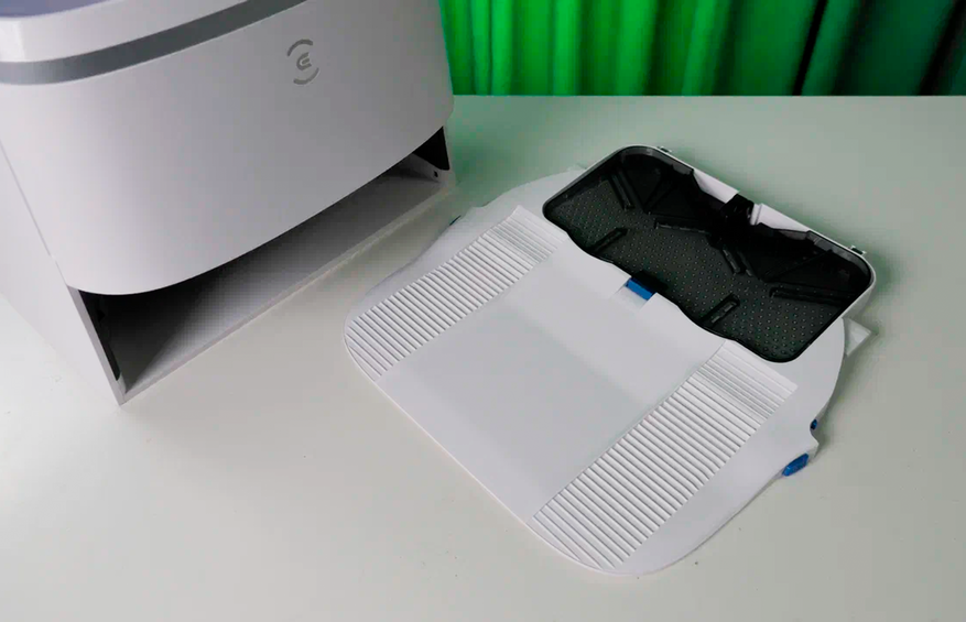 Принцип работы станции традиционный. Когда робот запарковался в док, из резервуара вверху поступает вода в поддон, причем по пути станция её подогревает до 70*, чтобы стирать салфетки более качественно. После того, как салфетки потрутся о крестовины в горячей воде, станция собирает отработанную жидкость в отдельный бачок, сушит мопики и заодно вытягивает мусор из пылесборника.