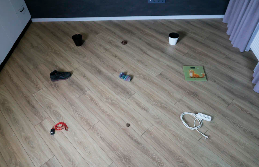 В комнате с препятствиями робота запускали с высокой чувствительностью фронтального датчика. С такой настройкой Deebot T30 Pro Omni показал отличные результаты! Успешно объехал крупные предметы, такие как кроссовка, сетевой фильтр и цветочные горшки, предметы среднего калибра типа носков, но самое главное — обошёл сюрпризы Рекса и Рыжика. Если у вас не самый дисциплинированный питомец, повод задуматься!