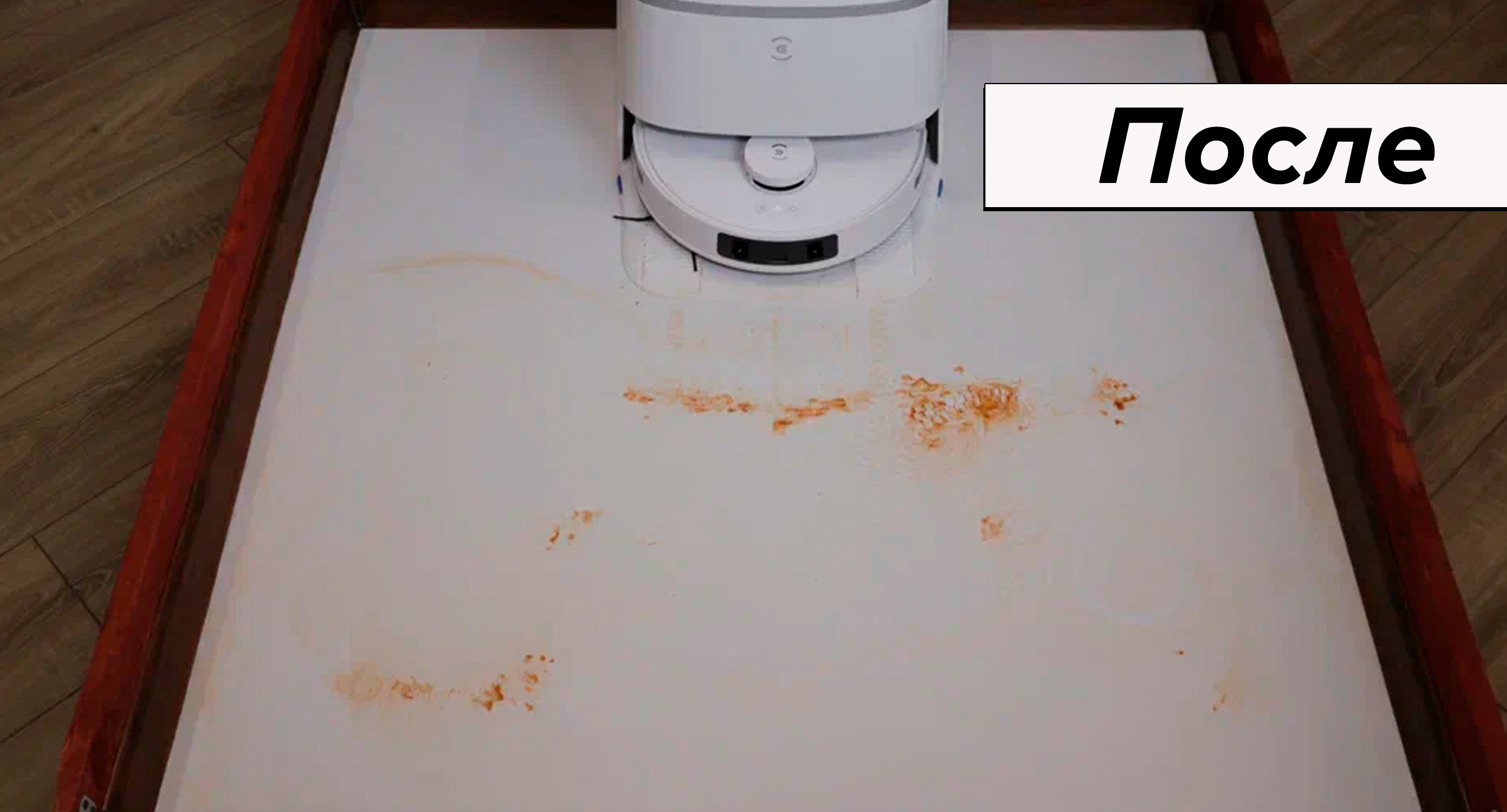 Интенсивность смачивания салфеток из встроенного бачка средняя. Чтобы отмыть присохшее кофе, роботу понадобилось 2 прохода. С соком справился быстрее — 1 проход.