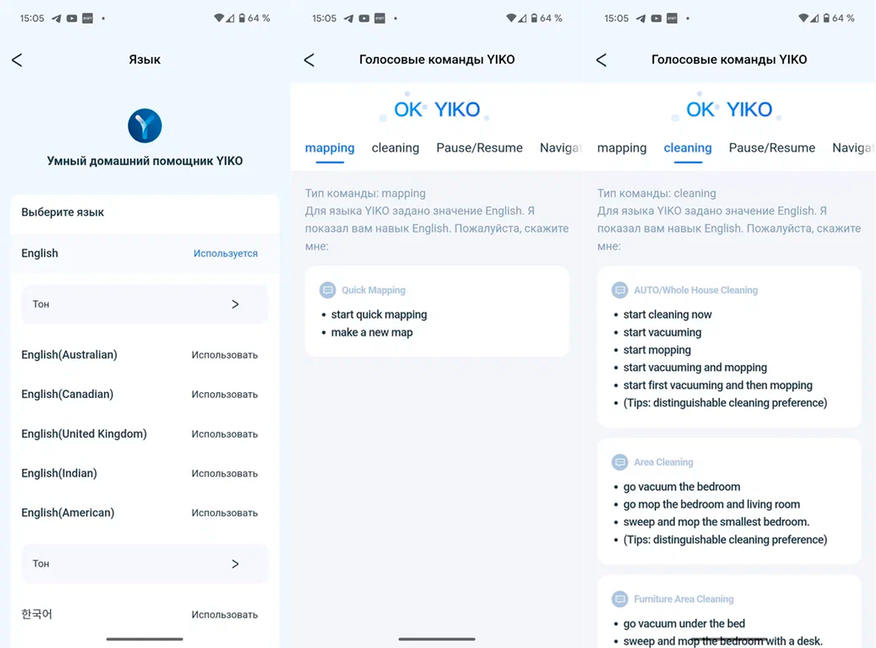 Помимо сторонних голосовых помощников, есть помощник Yiko, встроенный прямо в пылесос. Правда, он распознаёт только английский язык.