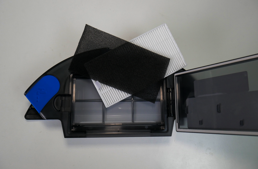Конейтнер совмещенного типа: коробка пылесборника окружена С-образным бачком. Камера для мусора маленькая — 400 мл, зато бак большой — 420 мл. Это как бы намекает на значимость влажной уборки у этой модели. Главная особенность контейнера — тройная фильтрация. Воздух проходит через сетку, поролон и лишь затем НЕРА-фильтр. При такой системе срок службы последнего возрастает.