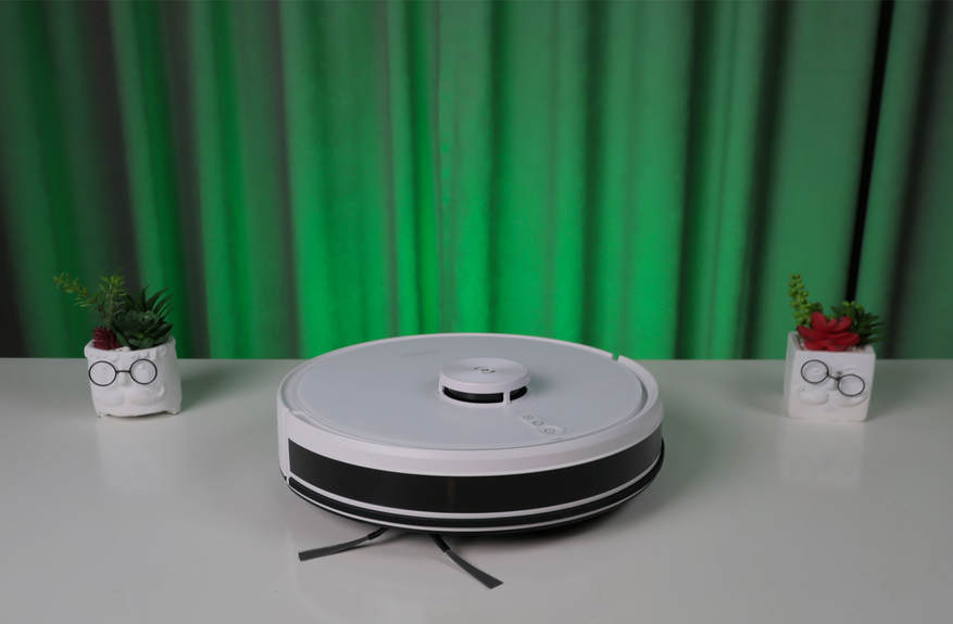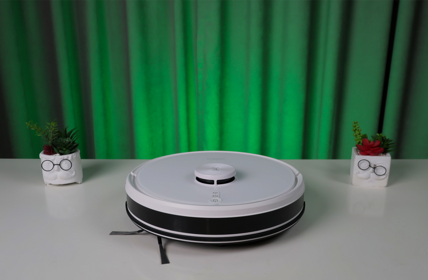 Дизайн классический с башенкой лидара в центре лицевой панели. Перед ним в ряд выстроились кнопки быстрого управления и индикатор интернет-подключения. Крышка прочная и матовая — в ходе тестовой эксплуатации обошлось без царапин. Габариты пылесоса нестандартные: диаметр на 2,5 см меньше аналогов — всего 326 мм. Высота обычная — 101 мм.