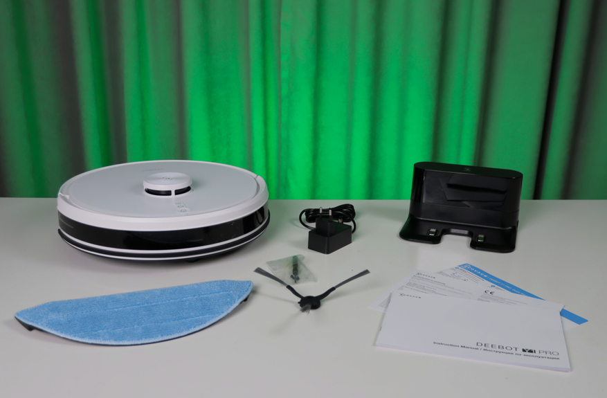 Комплект поставки максимально простой — только робот и то, без чего он не сможет работать: зарядная станция с адаптером, швабра с салфеткой, ну и сопроводительная документация. Из интересного разве что пакетик отверткой и болтиками — чтобы прикрутить торцевушку под днище.