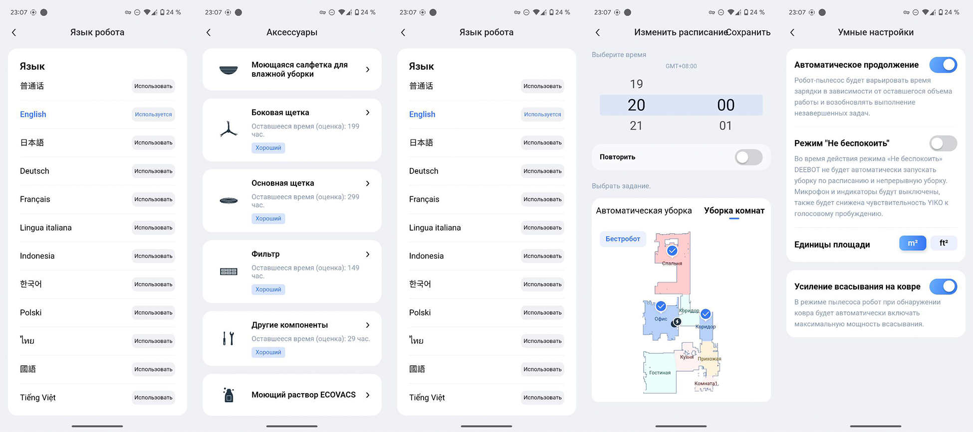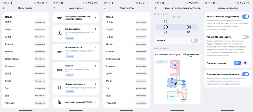 Функциональность у Deebot Y1 Pro ограниченная. Приложение хоть и русифицированное, но говорит пылесос на английском. Ни алгоритмов влажной уборки, ни персонализации настроек по комнатам у этой модели нет.