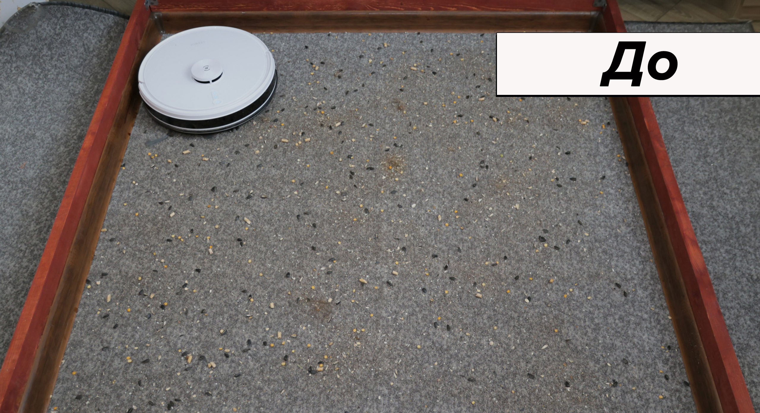 По меркам бюджетного сегмента пылесос отлично справился с мусором и песком на ламинате — собрал 94-95% мусора. Из углов не достал из-за круглой формы корпуса. Вторая причина недоработок — быстрая торцевая щётка, от которой соринки летят далеко в сторону. К примеру, пылесос качественно убирает периферию, а затем проходит зигзагами центр стенда и накидывает мусор в очищенные зоны.