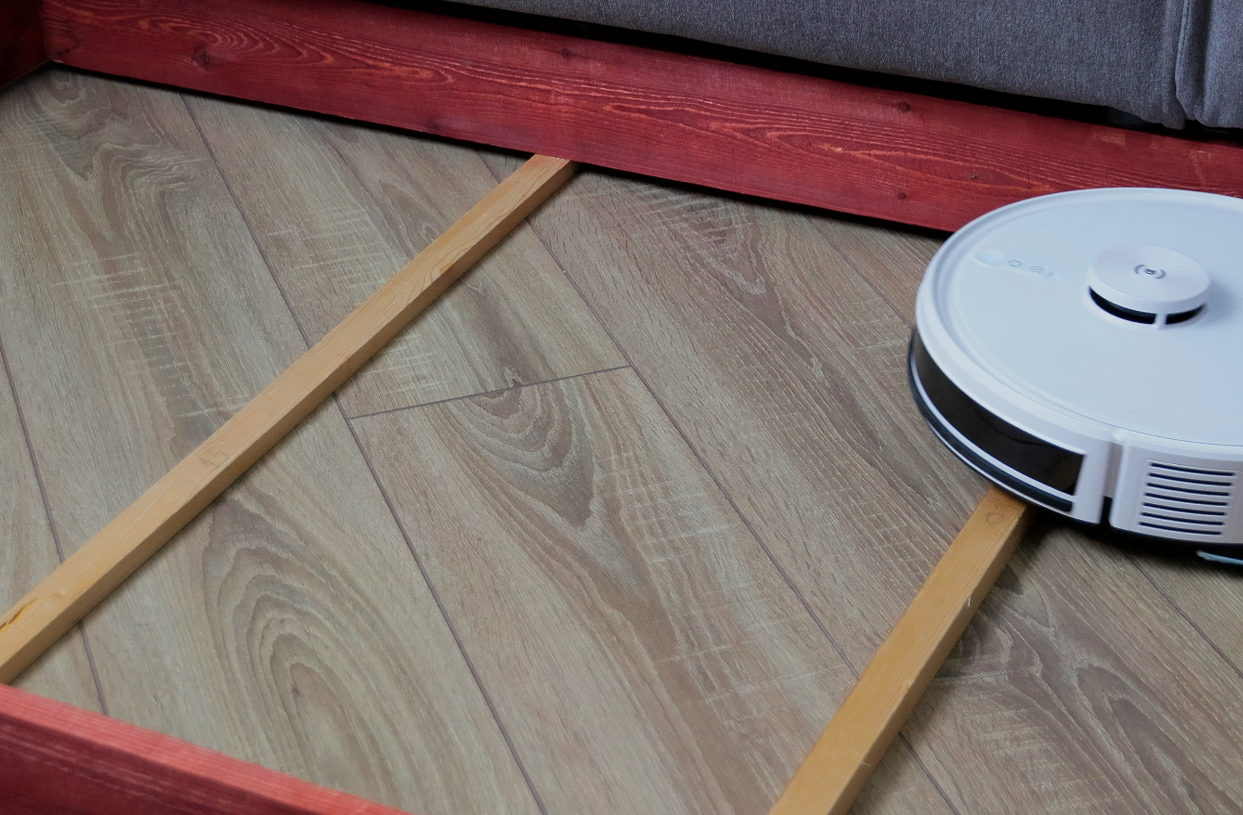 Ножки мебели видит с переменным успехом: иногда притормаживает, но чаще бьется на полном ходу. Ножки сушилки не любит — на них он просто зависает и выдаёт ошибку навигации. Пороги 1,5 см перескакивает легко, 2 см — практически непреодолимая задача.
