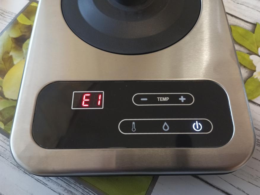 Если чайник снят с подставки, то на дисплее отображается надпись Е1 и все кнопки заблокированы. Управление разблокируется при установке чайника на место. Температура отображается даже холодной воды. Наливал воду из-под крана с температурой 18°C. Подставка меньше 20°C не отображает температуру. Управление простое, всего пять сенсорных кнопок: