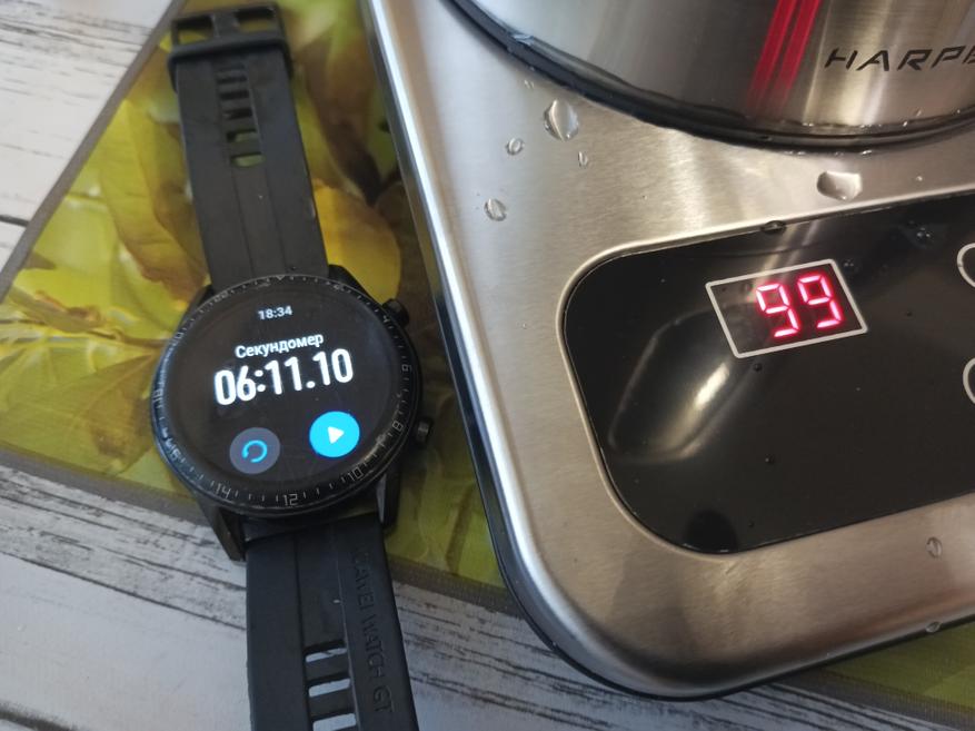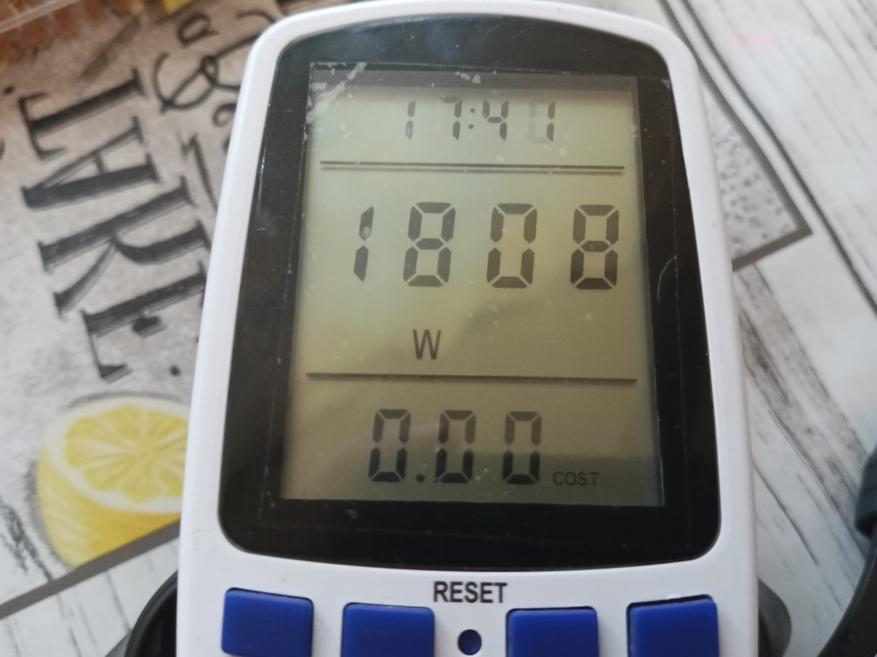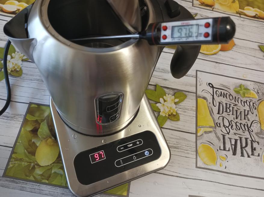 Чайник потребляет 1800 Вт при напряжении в электросети 210 В. Эксперимент будет проводиться на высоте над уровнем 539 метров. Вода закипает на отметке 98°C. Сверив встроенный термометр с моим, температуры были одинаковыми.