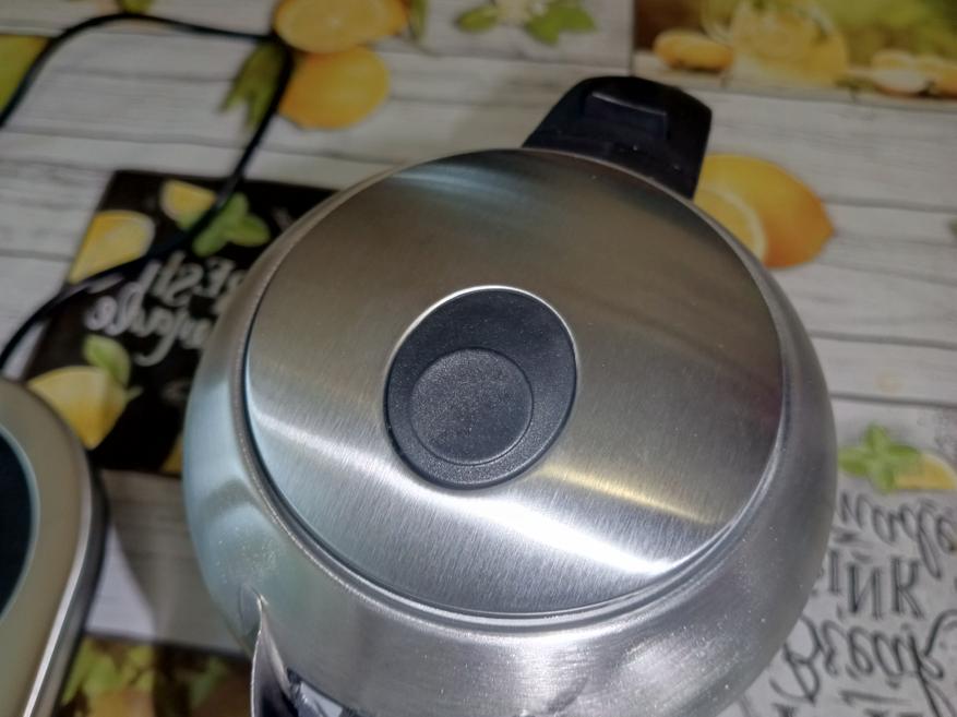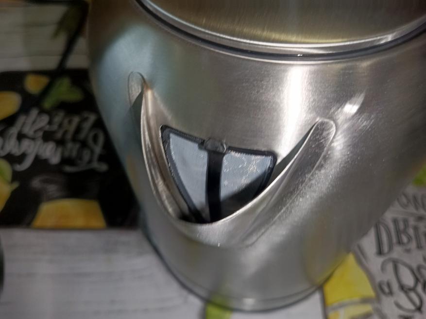 Носик также металлический, как и весь чайник. Внутри установлен фильтр, который легко снимается для очистки. Крышка открывается стандартно, с помощью кнопки установленной на рукояти. Есть один неприятный момент, крышка открывается примерно под углом 45 градусов, тем самым не совсем удобно наливать воду.