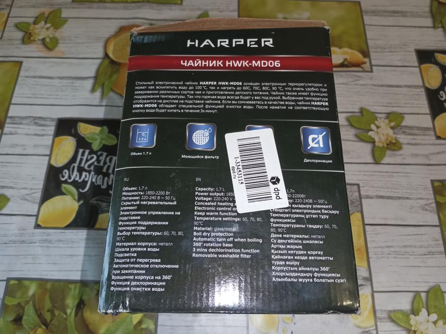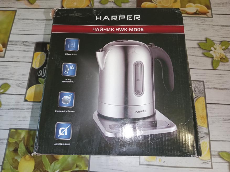 Электрический чайник Harper HWK-MD06 упакован в фирменную, картонную коробку.