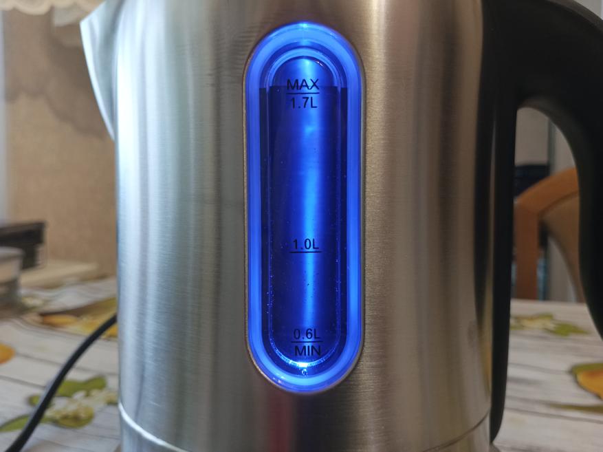 В чайнике встроена приятная подсветка, синего цвета. Светится сбоку окошко и носик чайника. Смотрится эффектно и дорого.