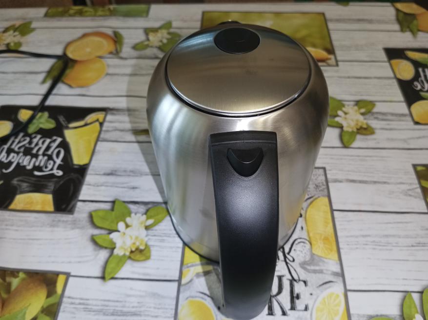 Минимальный объём воды 0.6 литра, а максимальный 1.7 литра. Есть ещё одна отметка на 1 литр. Рукоять массивная и удобная. В руке держать чайник удобно. При работе рукоять не нагревается.