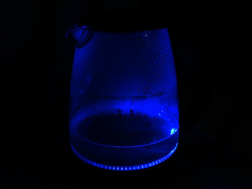 При работе чайника включается светодиодная подсветка синего цвета, которая особенно красиво смотрится в темноте.