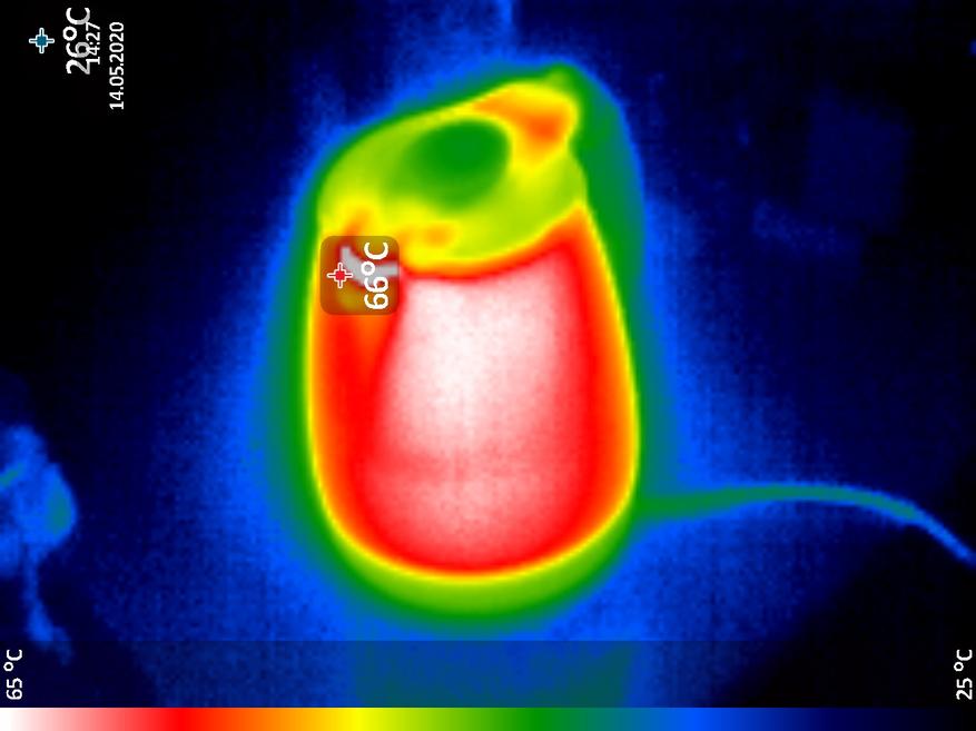 Температура стеклянной колбы немногим меньше температуры воды внутри чайника (около 80°C спустя 5 минут после закипания, согласно показаниям термощупа), поэтому касаться стекла не следует, иначе есть вероятность получить ожог. Можно это считать недостатком, но также это особенность, связанная с дизайном чайника, а пластиковая ручка в любом случае остаётся холодной.