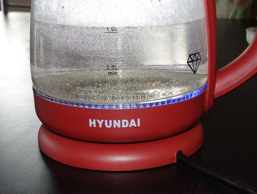 Чайник Hyundai HYK-G1002 полностью соответствует заявленным характеристикам — прибор хорошо справляется со своей, по сути, единственной функцией, связанной с нагревом воды.