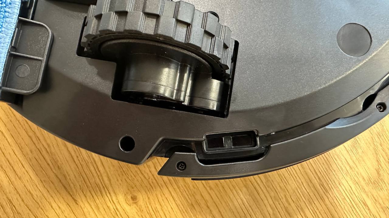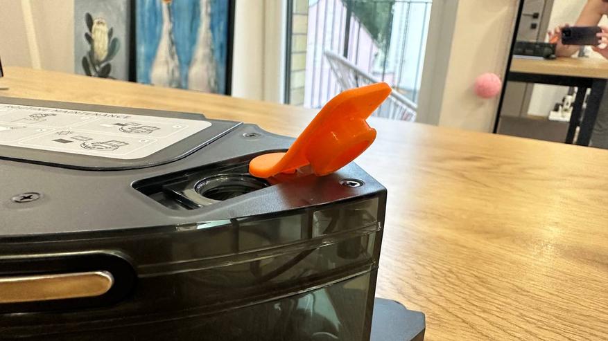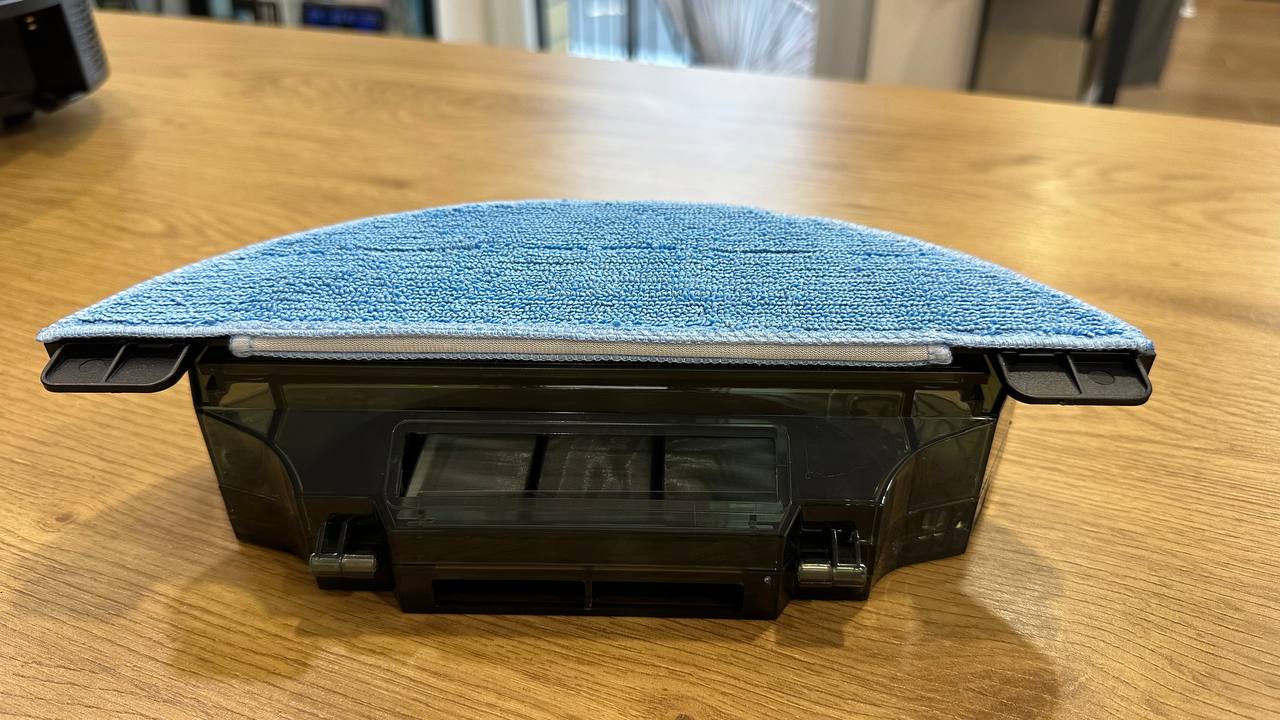 Для влажной уборки на корпусе предусмотрено крепление салфетки. Она фиксируется с помощью липучек, держится надёжно и не съезжает во время движения. Контейнер в этом режиме работает как резервуар для воды: залив осуществляется через отдельное отверстие под силиконовой заглушкой, которая предотвращает протекание. В конструкции предусмотрен датчик МОПа, он определяет наличие салфетки, и если та не установлена, система блокирует подачу воды. Это исключает случайное увлажнение пола в неподходящий момент, например, на ковре или при переноске.