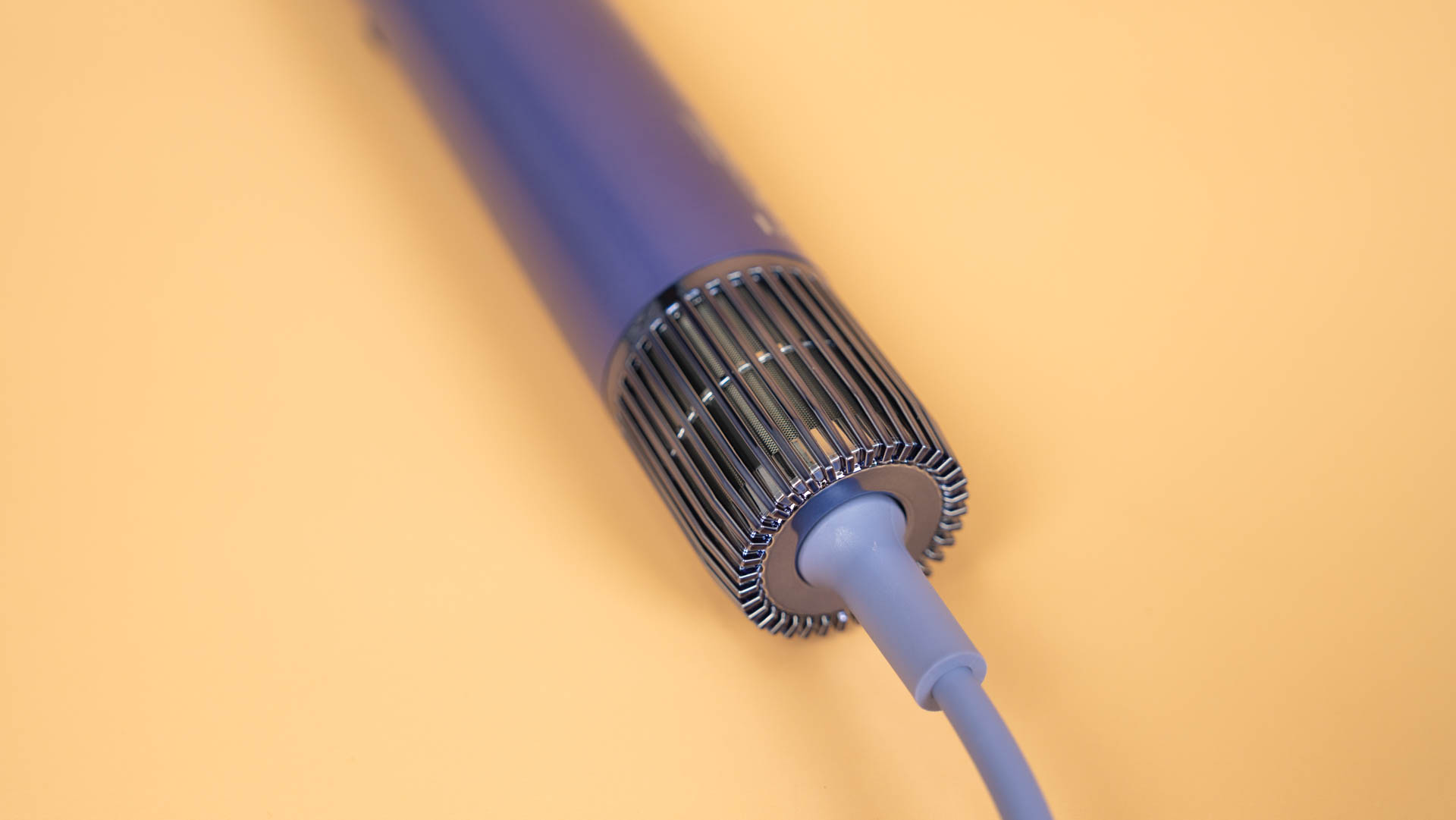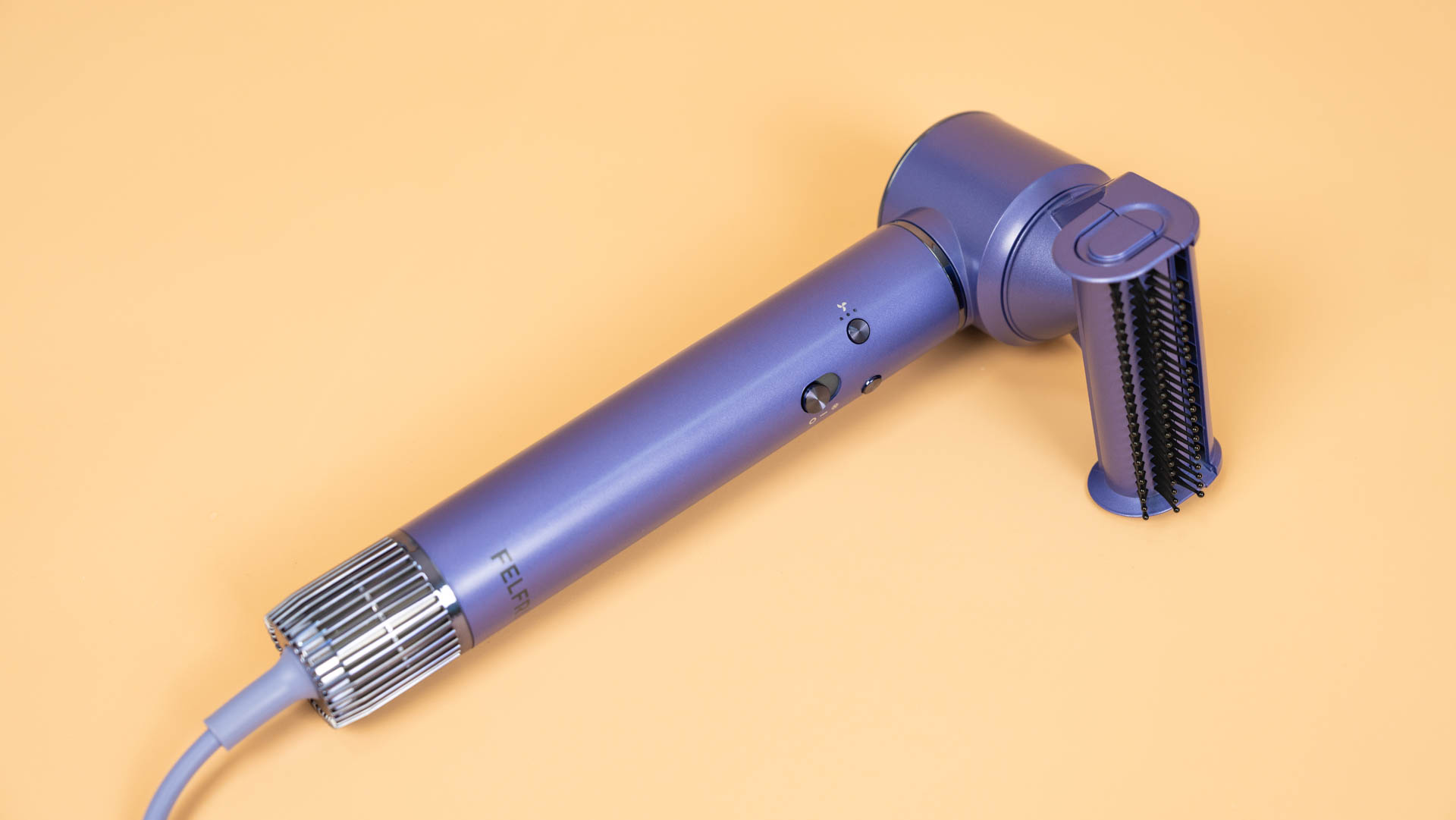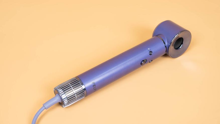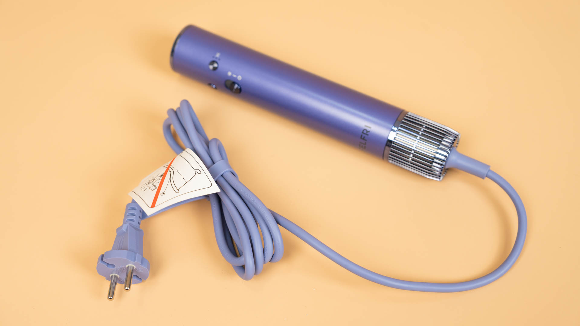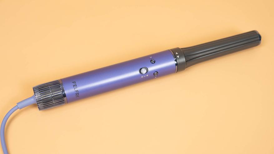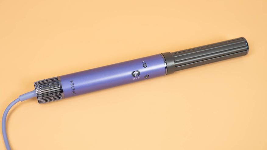 Фен-стайлер HD07 от компании Felfri обладает элегантным и практичным дизайном. Его центральный элемент — удлиненный корпус цилиндрической формы, достигающий в длину чуть более 30 см. Строгие очертания и полное отсутствие избыточных декоративных элементов акцентируют внимание на современном минималистичном облике устройства.