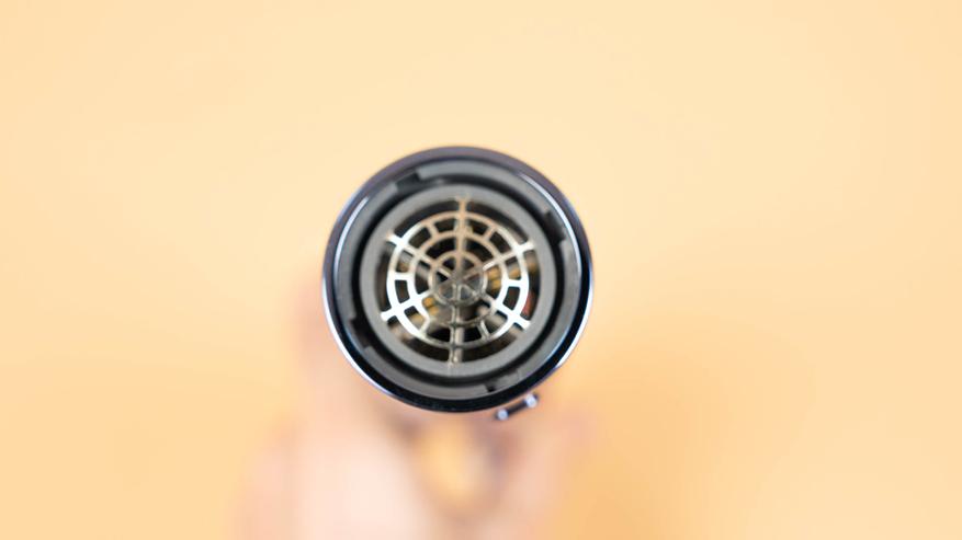 Забор воздуха осуществляется вентилятором, расположенным чуть ниже нагревательного элемента. Там же, под ручкой, находится магнитный защитный фильтр. Его основная функция — предотвращение попадания пыли и мусора внутрь прибора. Фильтр легко снимается для очистки благодаря магнитному креплению.