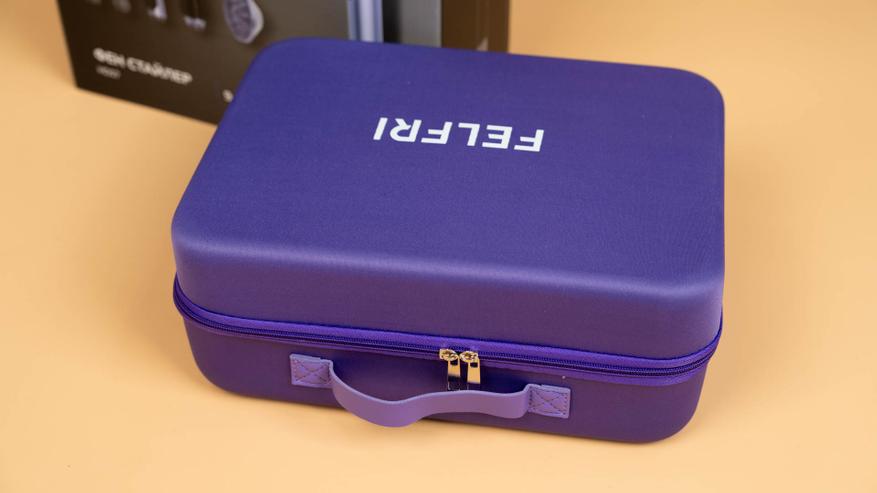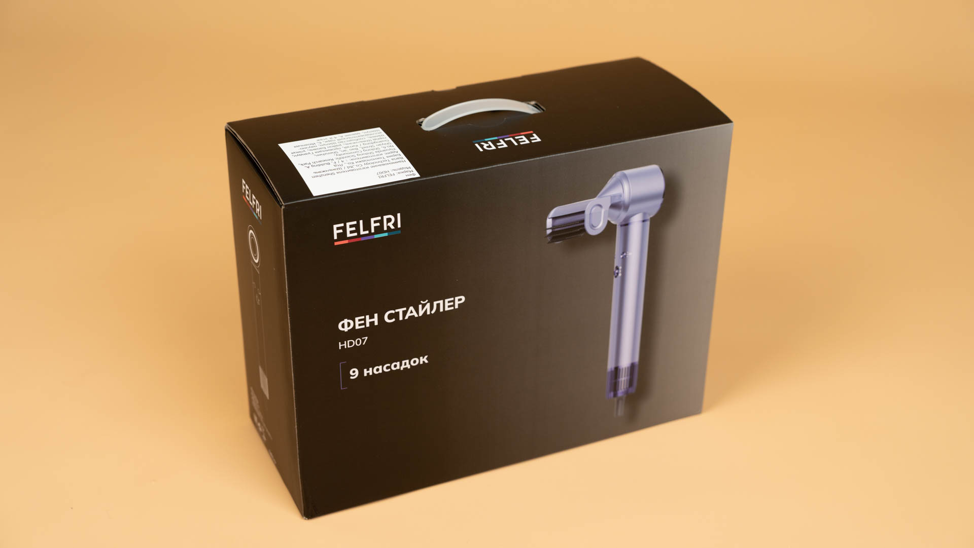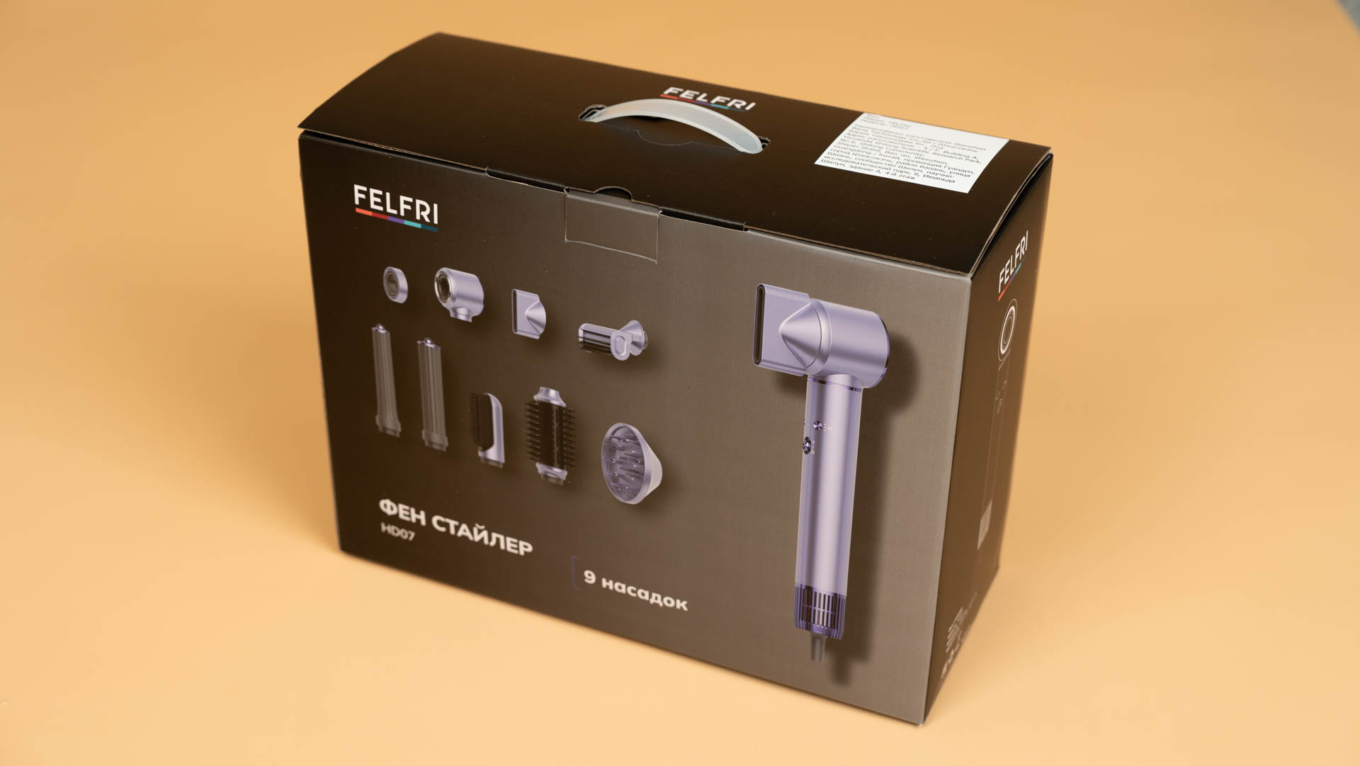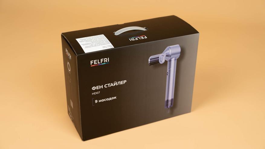 Внешняя коробка Felfri HD07, украшенная яркой печатью, содержит первичную информацию о фен-стайлере, предназначенную для ознакомления.