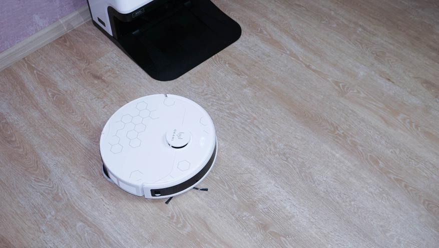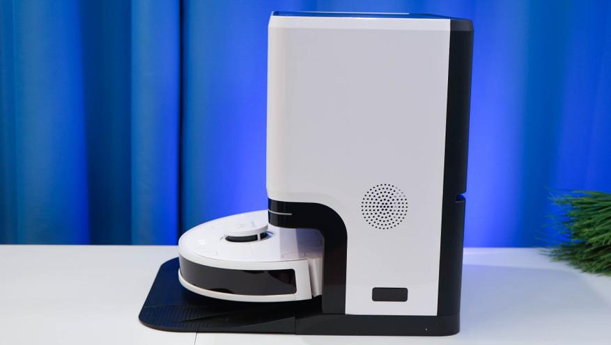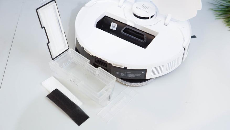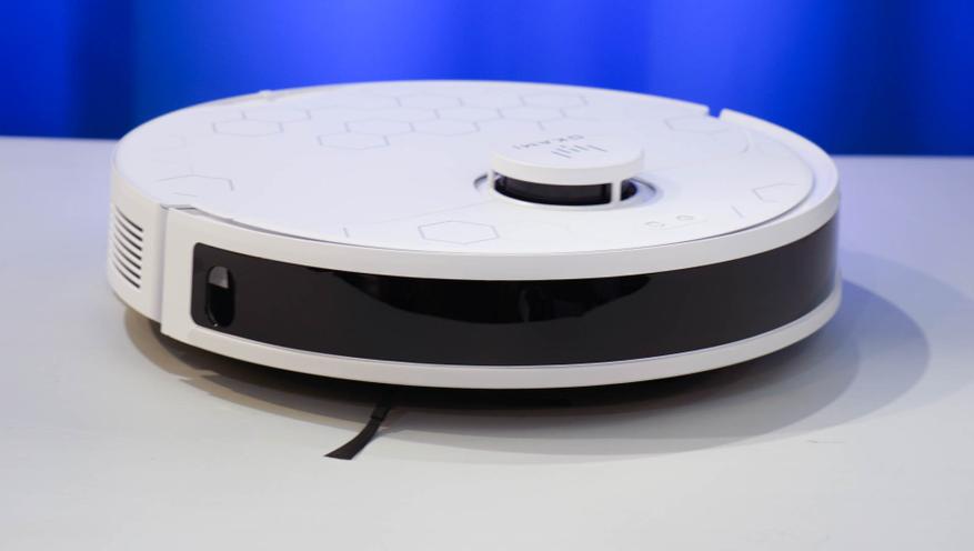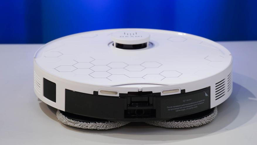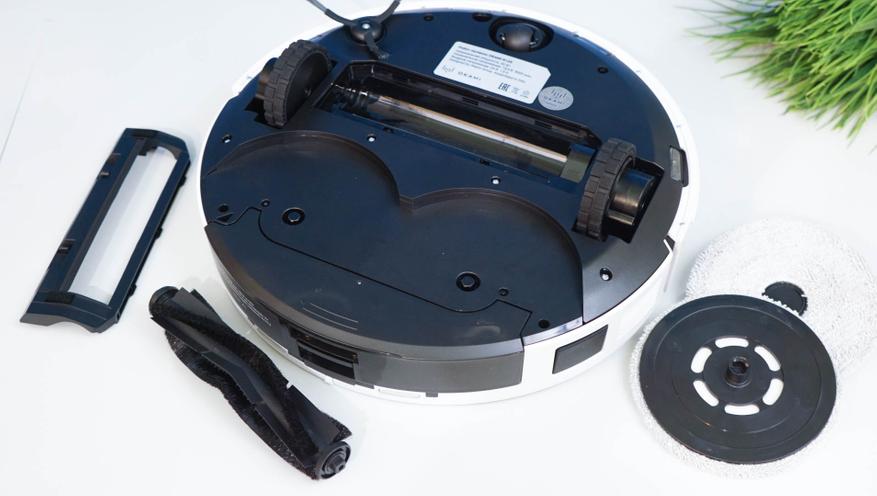 Робот-пылесос представляет собой классическую модель с диаметром 350 мм и высотой (с учетом «башенки») 9.8 сантиметра. Такой робот вполне может проводить уборку под мебелью на невысоких ножках (10+ см). Предусматривается одна боковая щетка, центральный ролик с комбинированной жесткостью (резина+щетки V-образной формы), а также сразу два дисковых привода с салфетками для влажной уборки. Помимо «башенки» с лидаром, в корпусе по бокам расположены ToF сенсоры, позволяющие точно определять расстояние до объектов.