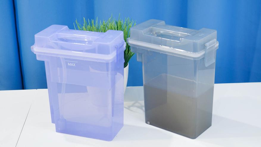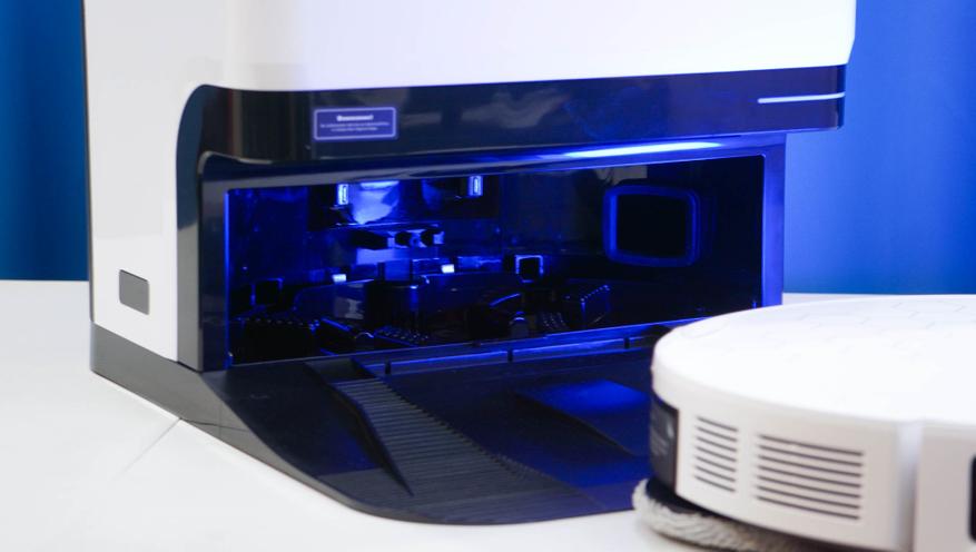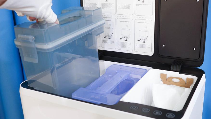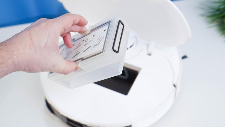В самой станции располагается мешок в качестве пылесборника, а также два вместительных резервуара, позволяющие хранить воду (чистую воду, а также отходы, которые образуются при мойке салфеток робота) из расчета на период обслуживания. Контейнеры легко извлекаются, оснащаются силиконовым уплотнителем от протечек, а также системой контроля уровня. Различать их можно по цвету, а примерный уровень можно оценить «на глазок» — корпуса выполнены из полупрозрачного пластика.