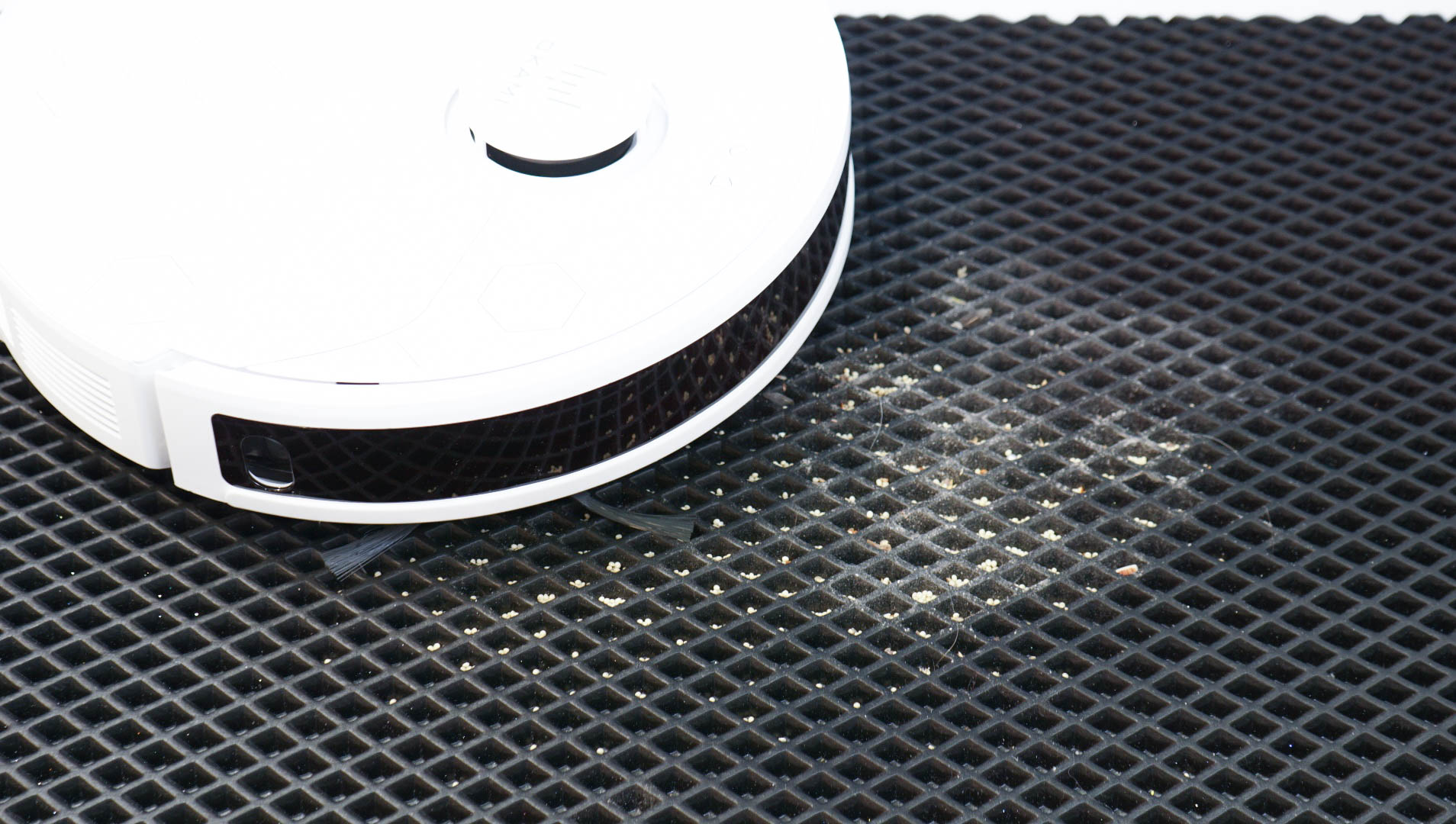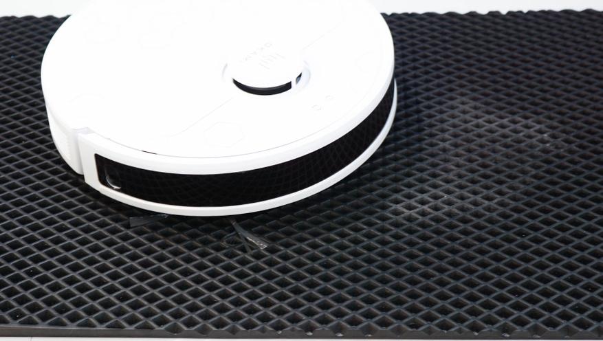 Небольшой тест на силу всасывания можно провести в коврами. Некоторые пылесосы не имеют мощного всасывания и не могут полностью извлечь мелкий мусор из ячеек eva-коврика или же с трудом пылесосят ковры с ворсом. Что же касается робота пылесоса OKAMI R135, то тут не возникло проблем — весь мусор убран без остатка. На коврах в автомате повышается мощность всасывания. Напомню, что заявлена мощность в 8 кПа в максимальном режиме. В режиме влажной уборки робот поднимает мопы при попадании на ковер.
