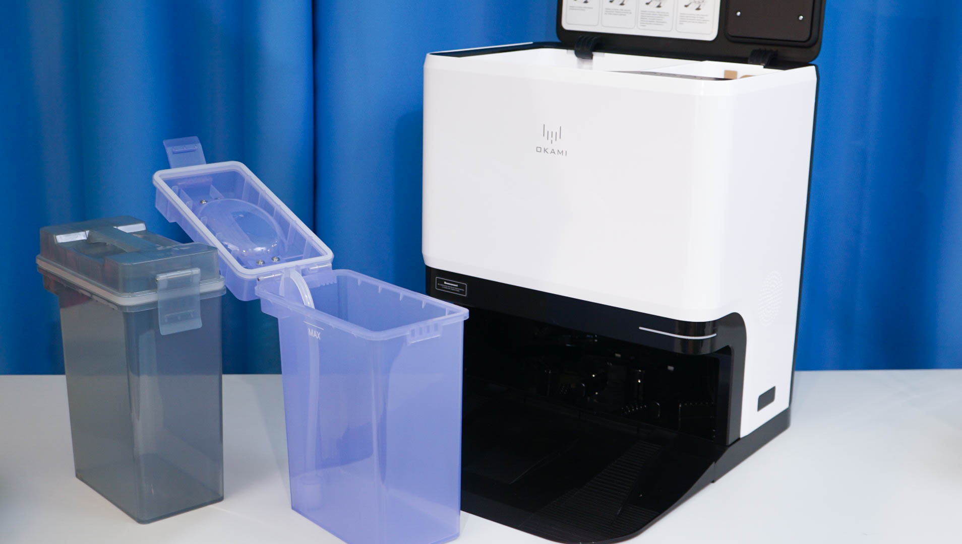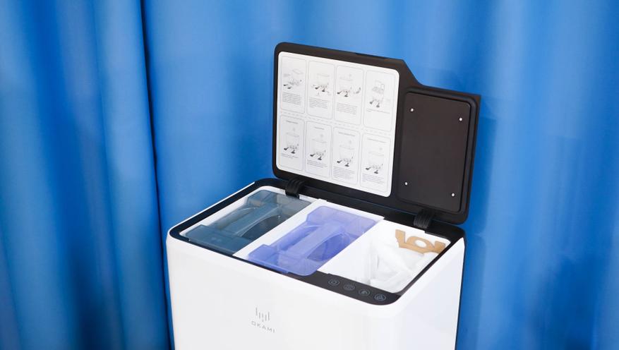 Станция самоочистки робота пылесоса OKAMI R135 выглядит больше, чем просто зарядная станция. И это оправдано — внутри спрятана сложная система, позволяющая не только заряжать робота, но и проводить автоматическую влажную и сухую очистку его салфеток и контейнера. Резервуары вполне можно обновлять раз в неделю, а мешок для мусора заменять раз в 2-3 месяца. Размер станции самоочистки составляет примерно 44 на 40 сантиметров при высоте 47 сантиметров.