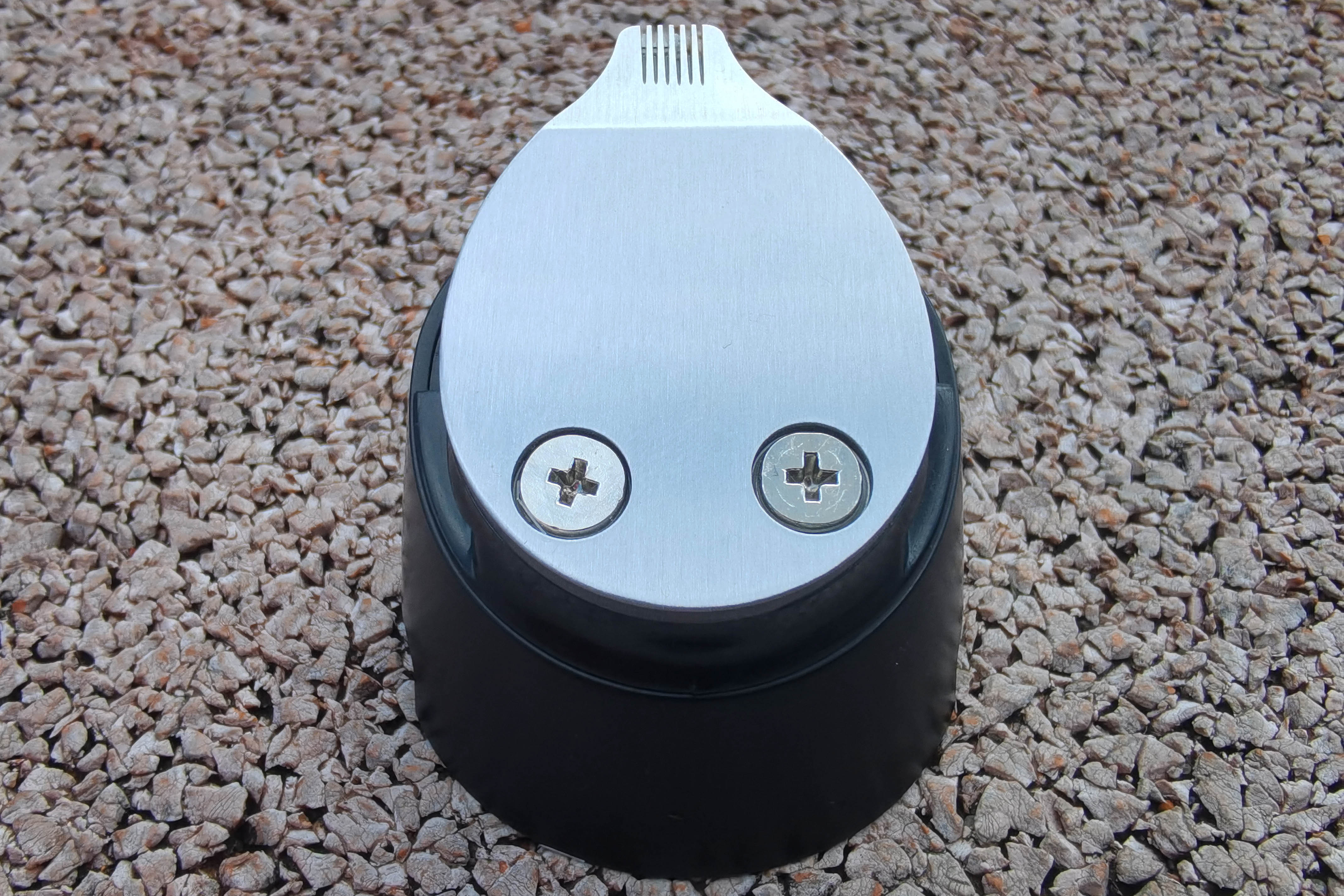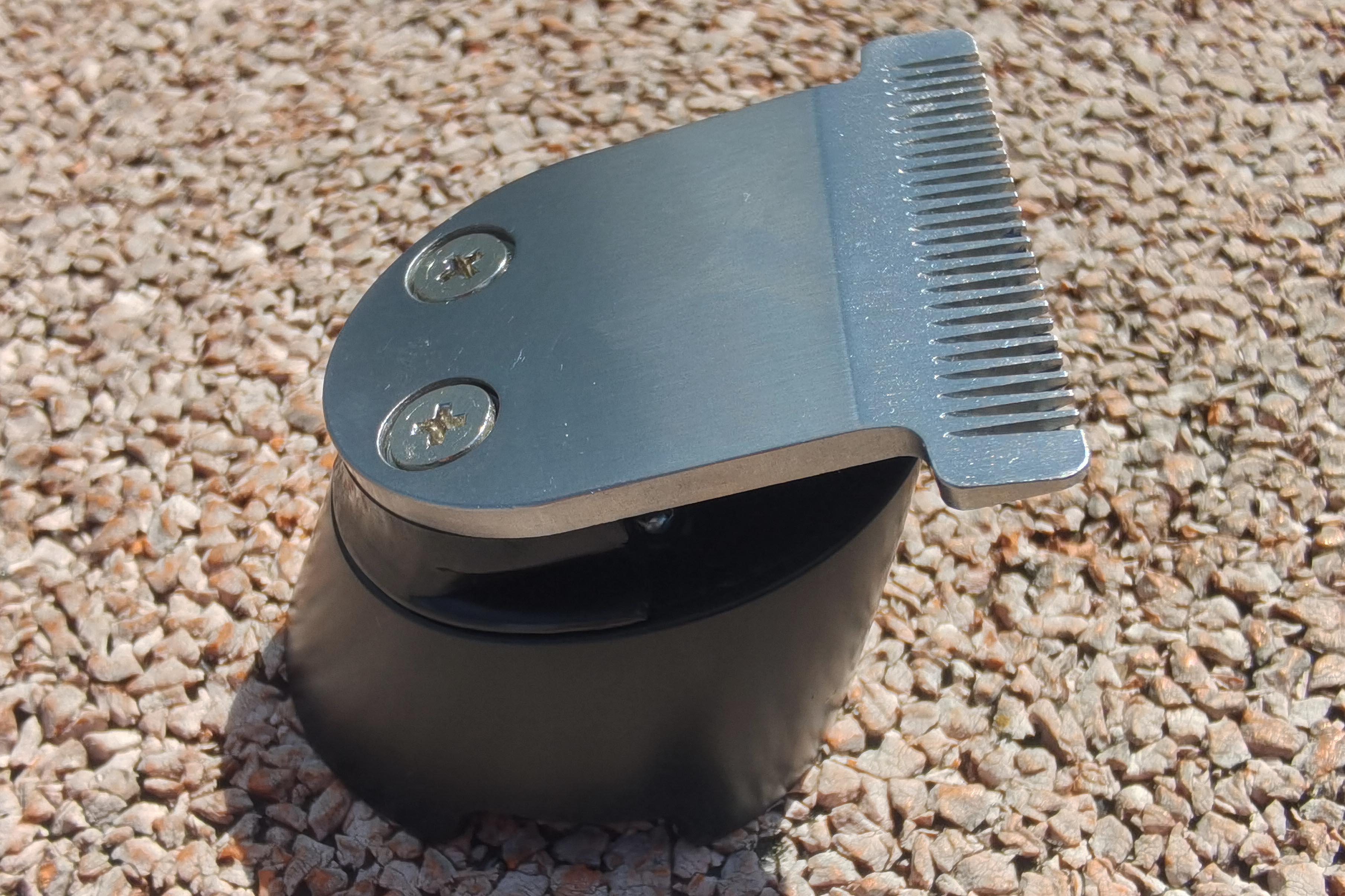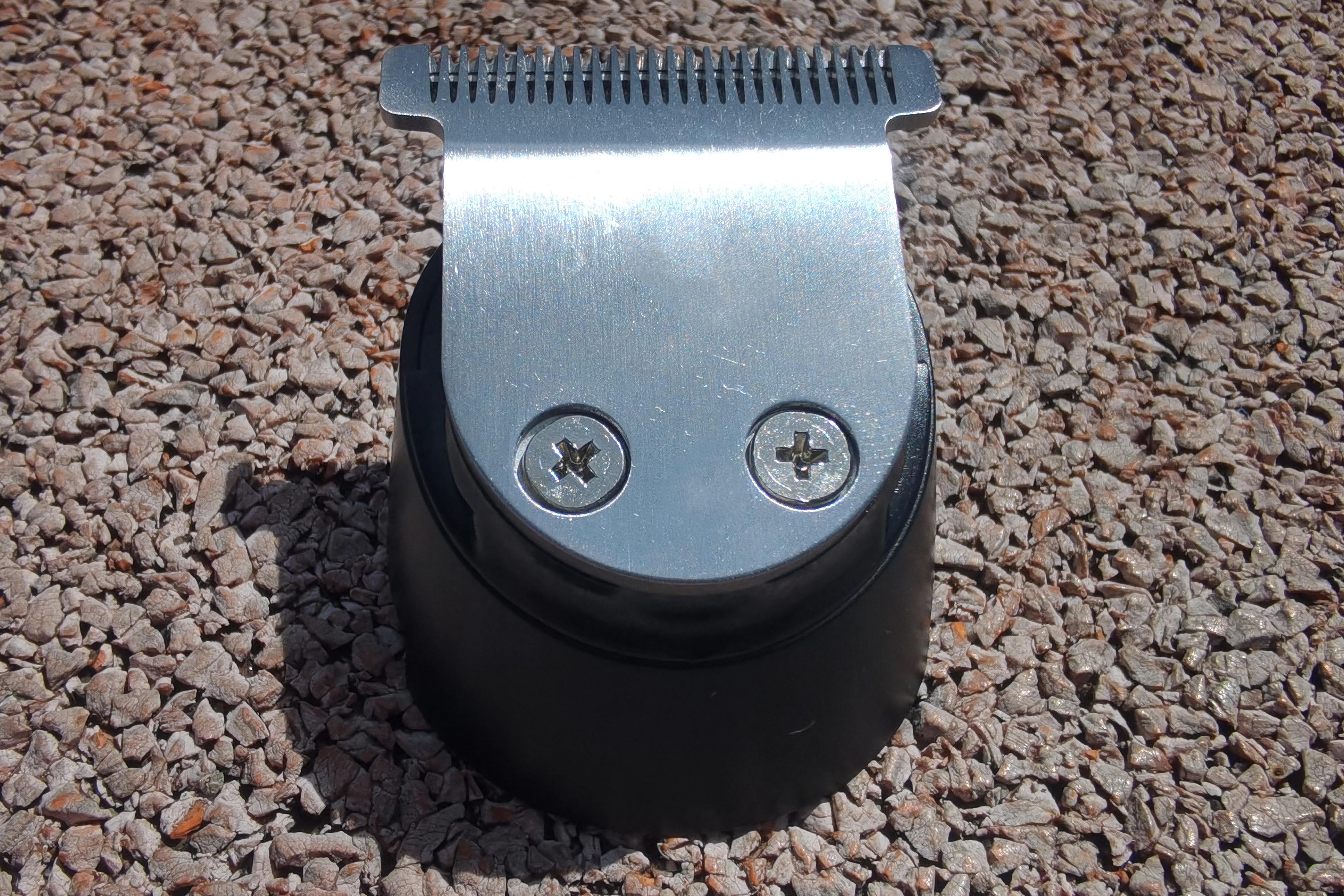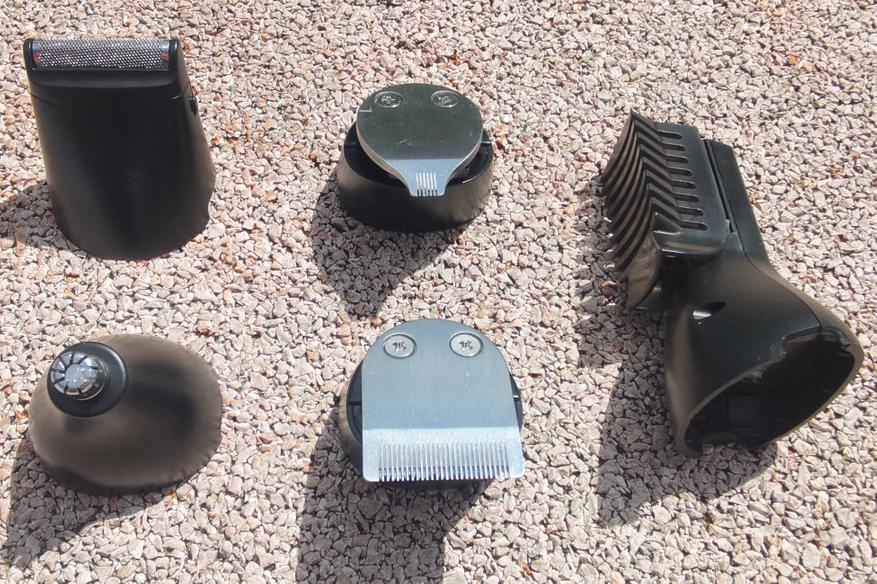 Ножи бреющих блоков выполнены из нержавеющей стали. Все три триммера схожи друг с другом, различаясь, по сути, лишь шириной режущей части: 32 мм у насадки для головы, 24 мм — у отвечающей за бороду и 4 мм — у дизайнерской, служащей для срезания отдельных волосков, подравнивая бровей и выбривания узоров. При необходимости бреющие элементы можно разобрать, открутив металлическими винты.