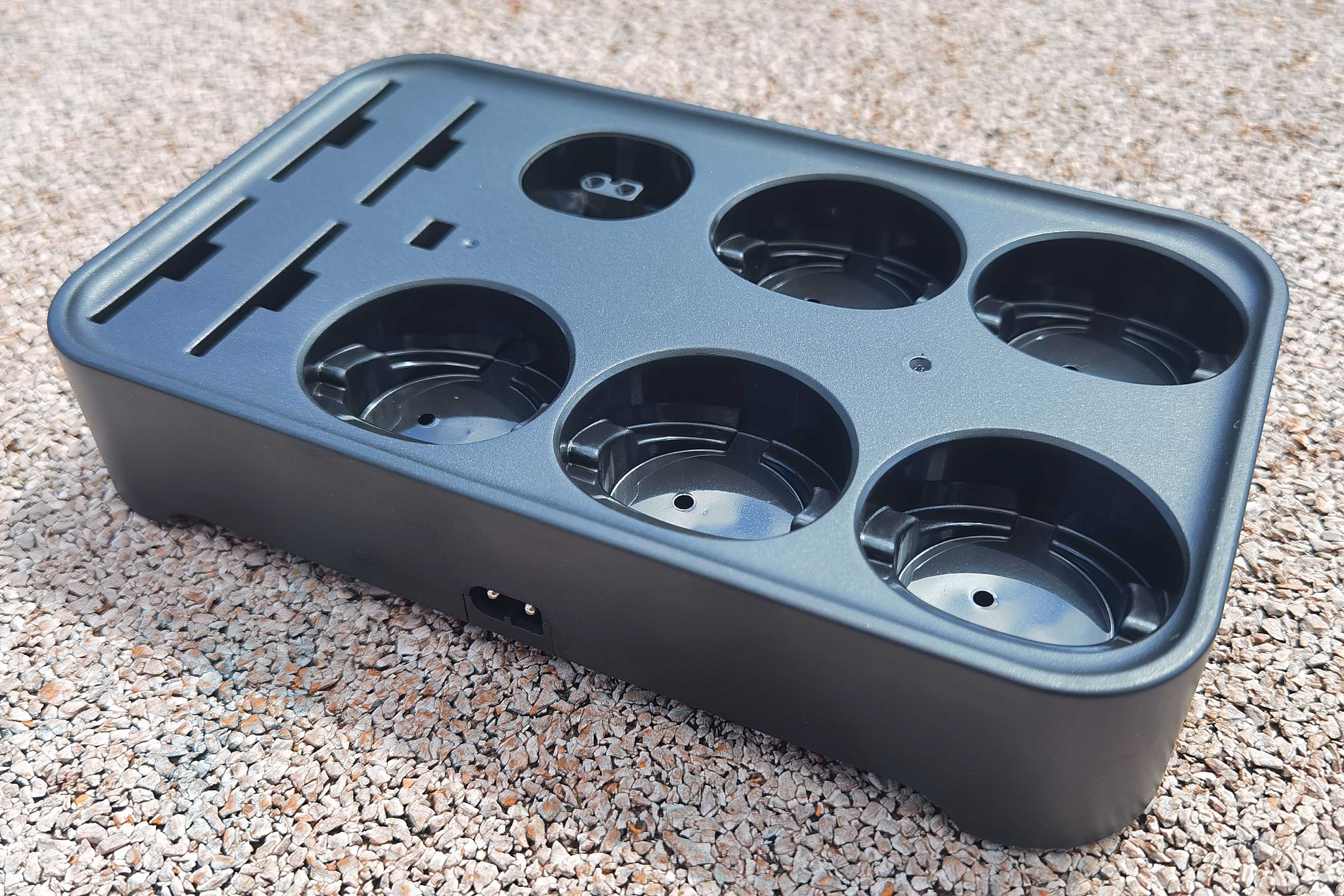 Пластиковая подставка габаритами 185x110 мм имеет прорезиненные ножки для лучшего сцепления с опорной поверхностью и вмещает в себя все аксессуары за исключением масленки.