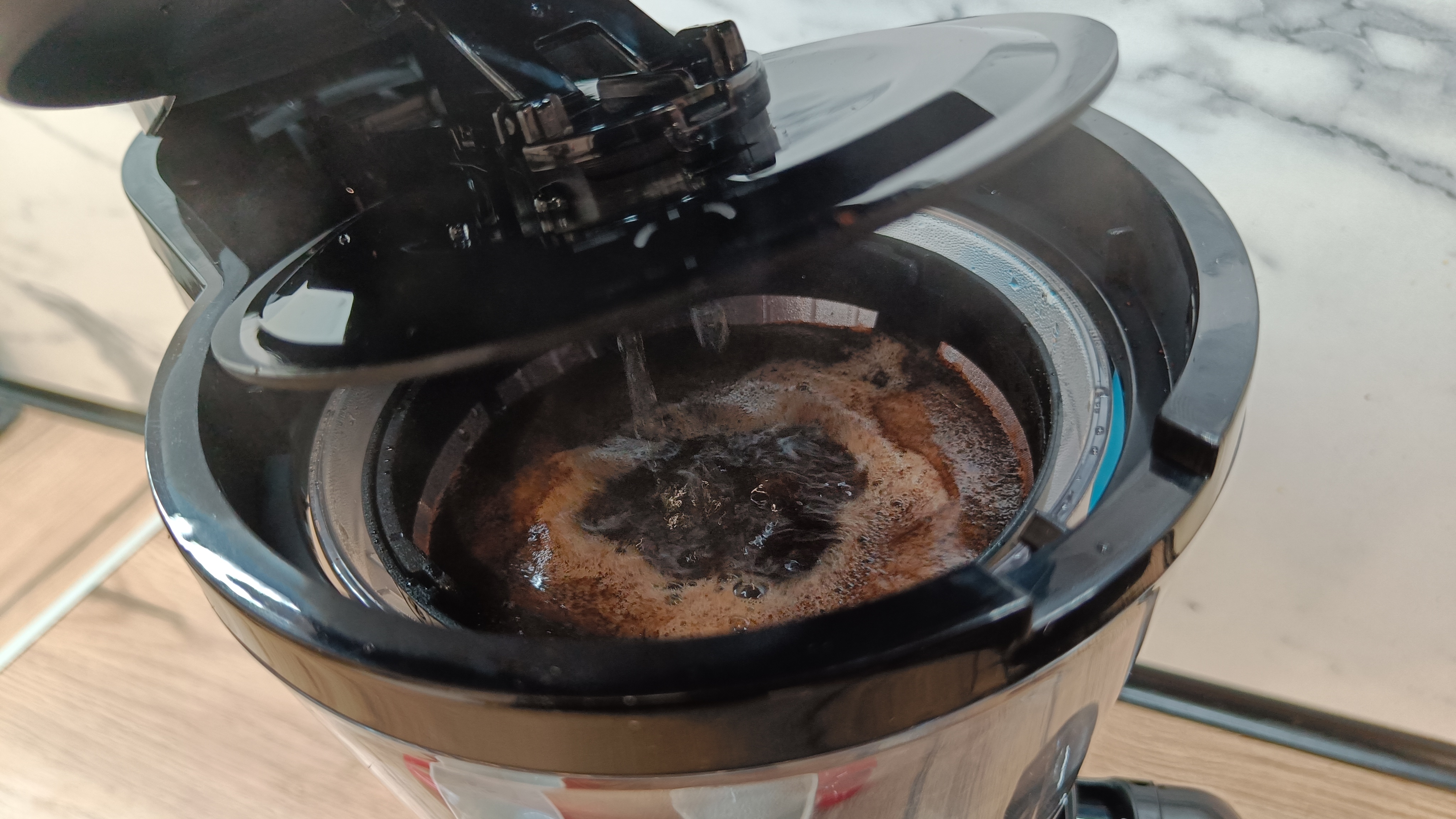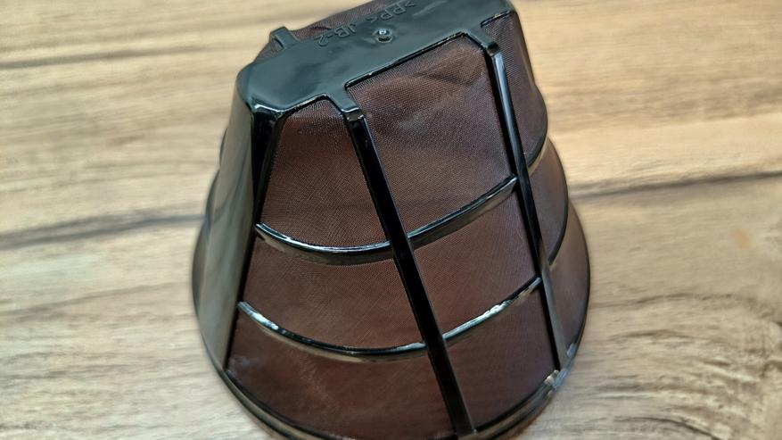 Капельная кофеварка выполнена в классическом стиле с нижним размещением стеклянного кувшина и подогревающей пластиной. В верхней части размещается откидная крышка, под которой установлен сетчатый фильтр для молотого кофе и контейнер для воды. Во время приготовления кофе не рекомендуется прикасаться к этой крышке, так как она довольно горячая. Фильтр и держатель можно снять, чтобы обслужить или в случае повреждения заменить. Сетка фильтра выполнена из коричневого пластика и при длительной эксплуатации не потемнеет, как обычно бывает с белыми фильтрами. На держателе фильтра можно увидеть систему стоп капля.