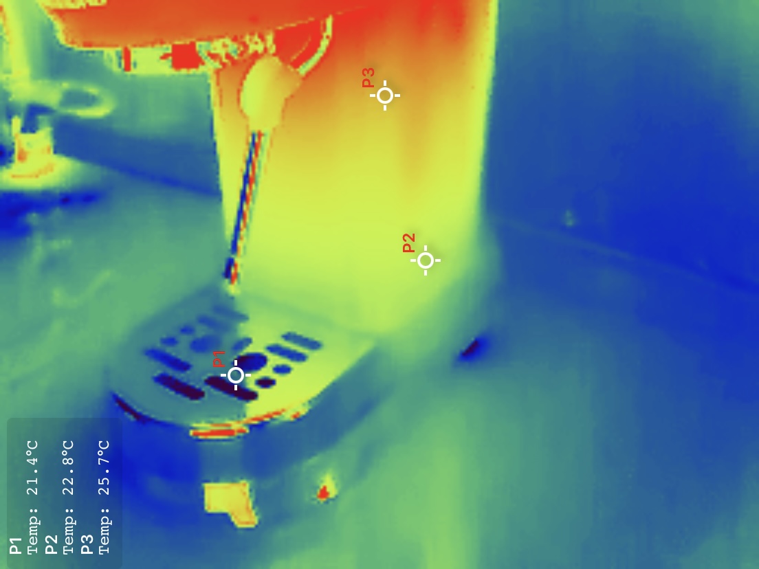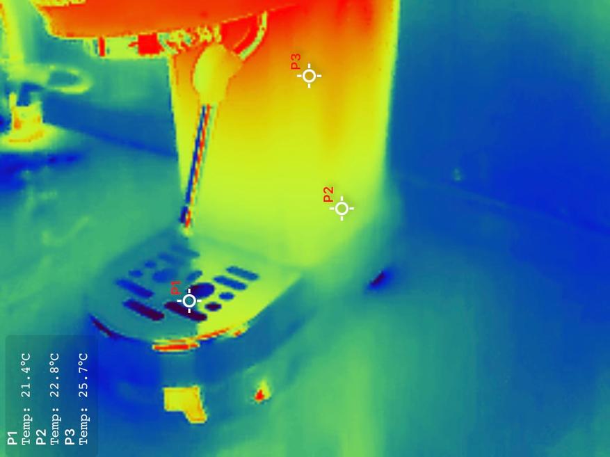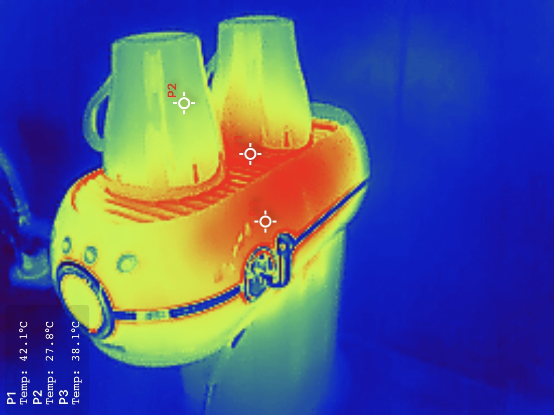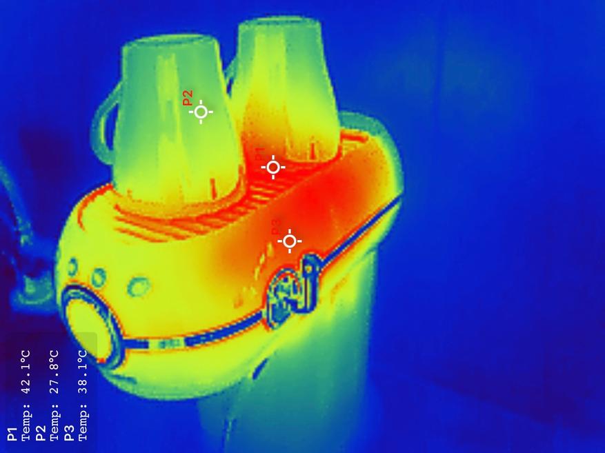 В основном нагрев при помощи тепловизора виден только в верхней части, где и осуществляется нагрев кружек. Максимально зафиксированная температура составляет 42 градуса.