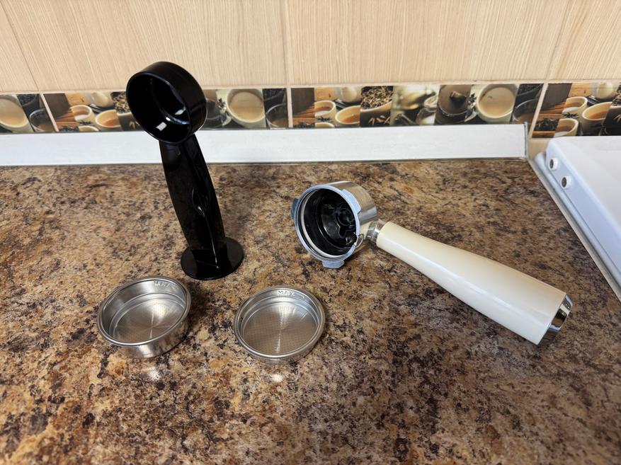 Руководство по использованию содержит много важных аспектов, которые необходимо учитывать во время использования кофеварки. Также в комплекте у нас имеется книга рецептов, благодаря которой мы можем приготовить нестандартные решения на каждый день. Для приготовления эспрессо у нас есть 2 металлических фильтра с разным объемом, на дне фильтров присутствует надпись 1 cup и 2 cup, что соответствует обычному эспрессо и двойному эспрессо. Мерная ложка с темпером выполнена в черном цвете и изготовлена из пищевого пластика. Фильтродержатель изготовлен из металла, но с пластиковой бежевой рукоятью, которая прекрасно сочетается с общим цветом корпуса кофеварки.