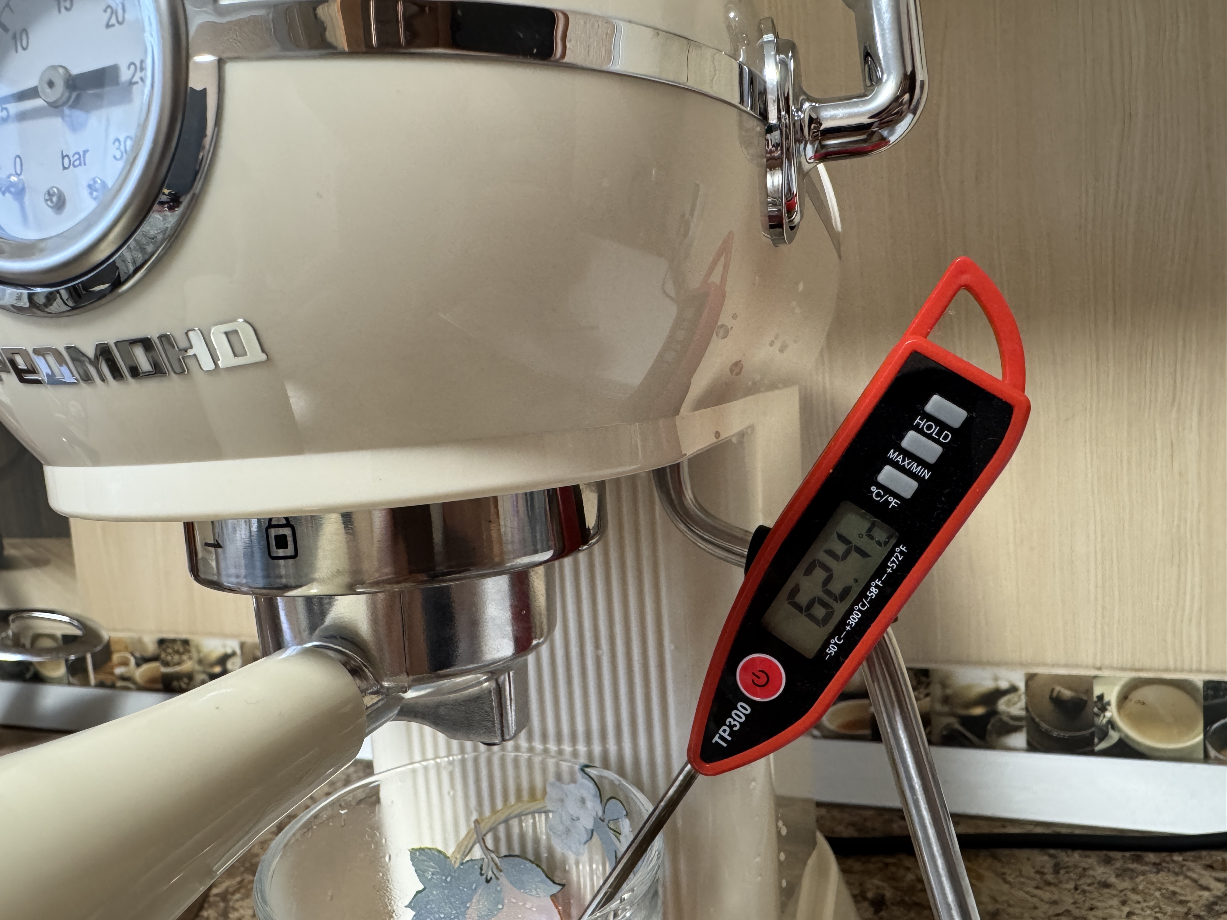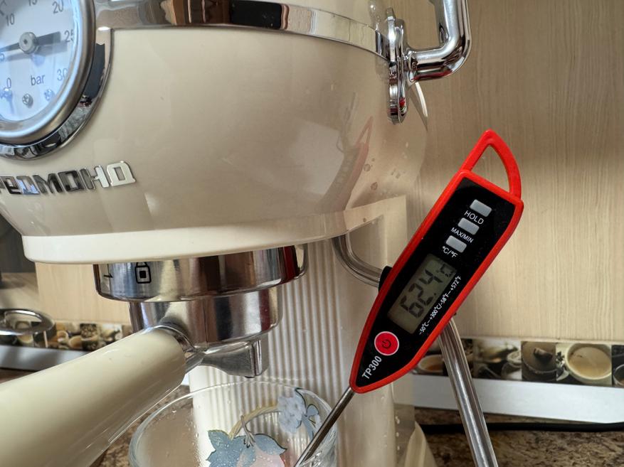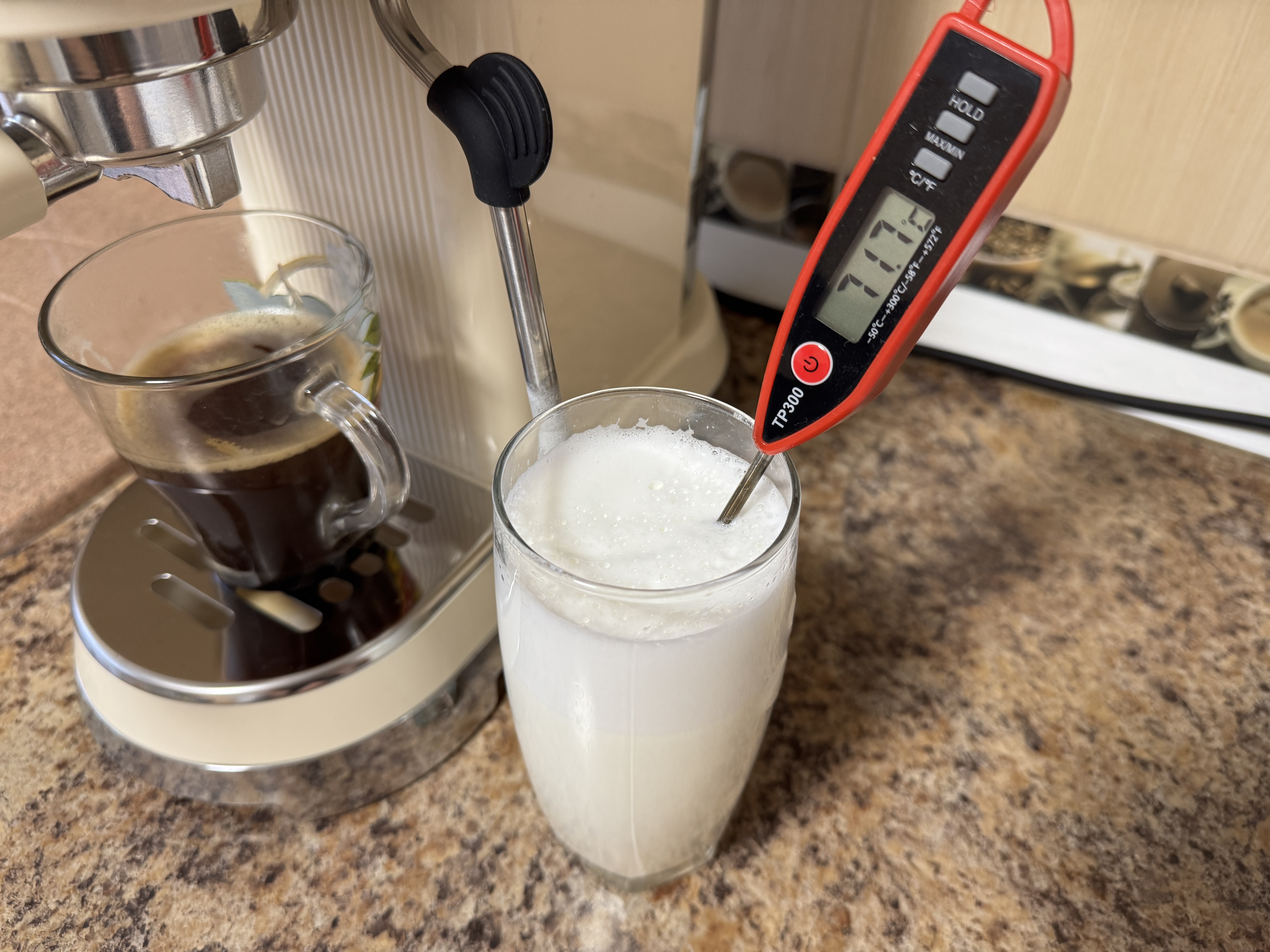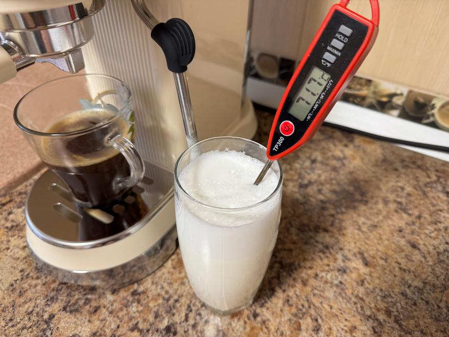 После приготовления эспрессо мы получаем температуру в районе 62 градусов. Холодное молоко после вспенивания нагревается до 71 градуса.