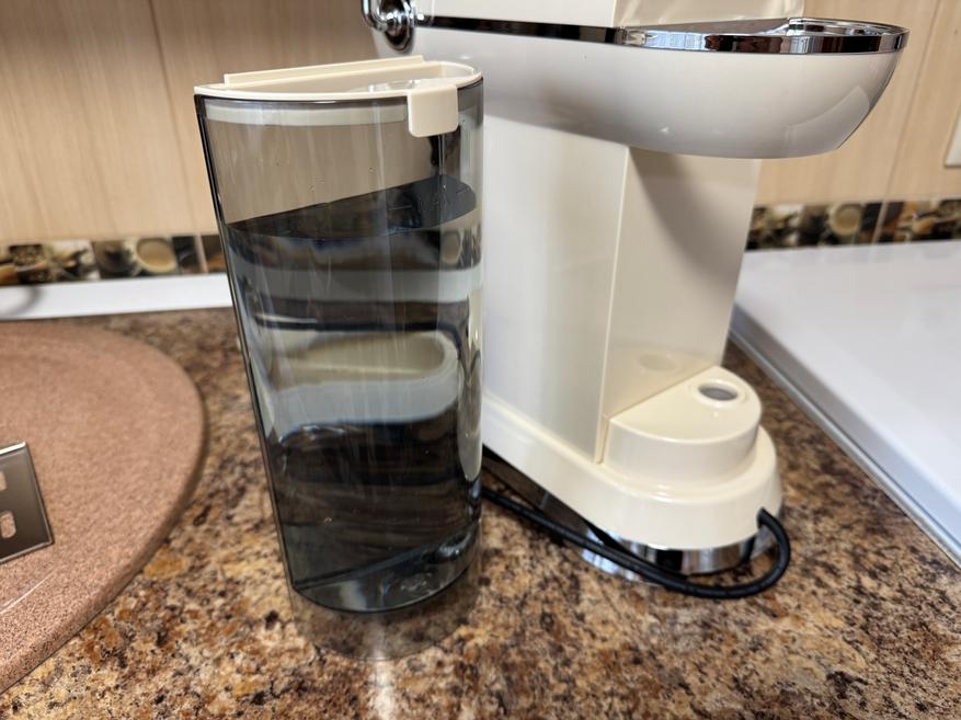Основная панель управления расположена на лицевой части и содержит 4 физические кнопки со светодиодной индикацией. Первая кнопка используется для включения и отключения кофеварки, вторая и третья кнопки используются для приготовления эспрессо, четвертая кнопка включает нагрев для использования парового режима. Под кнопками управления находится манометр для визуального контроля давления. В основе кофеварки установлена итальянская помпа"Ulka", которая может создать давление 15 бар для раскрытия вкусовых качеств кофе. Устанавливается кружка на металлическую панель с отверстиями для сбора жидкости. Поддон для сбора капель изготовлен из пластика и имеет красный индикатор, по которому можно оценить заполнение лотка. На задней части имеется посадочное место под пластиковый резервуар с объемом 0,8 литра. Резервуар прозрачный и имеет мерную шкалу для визуального контроля остаточного уровня очищенной воды. Резервуар для воды закрывается декоративной пластиковой крышкой под цвет основного корпуса.
