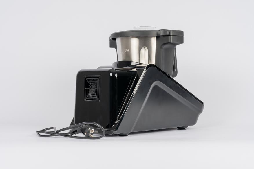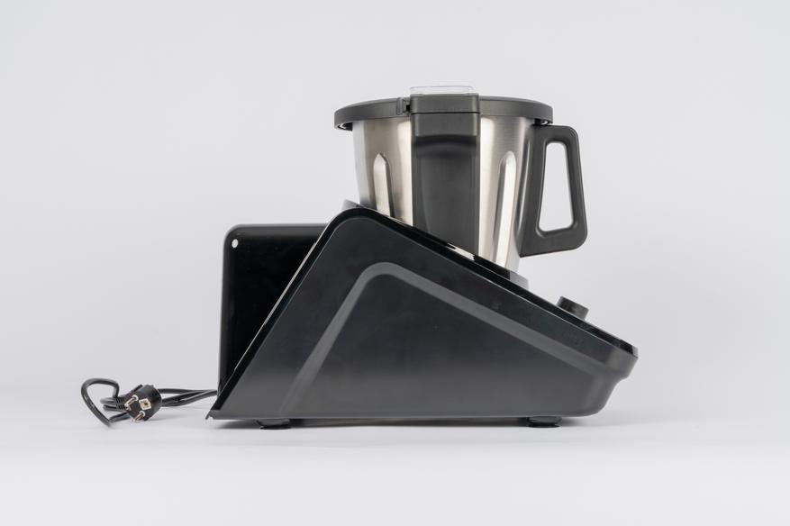 Эргономичный силуэт кухонного робота имеет обтекаемую форму: задняя часть, где расположен двигатель с вентиляционной решеткой, немного шире, а боковые панели плавно сужаются к передней стороне.