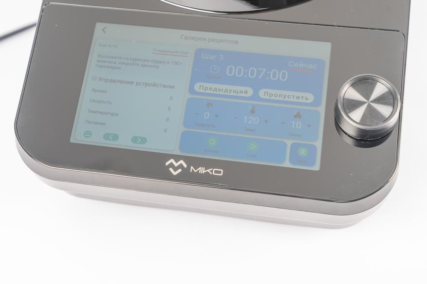 При готовке справа отображаются текущие параметры: номер шага (с возможностью пропустить или вернуться назад), время с обратным отсчётом, скорость, температура и мощность. Здесь же есть кнопки «Отмена» и «Стоп», а также функция паузы, если нужно добавить ингредиенты и воспользоваться весами.
