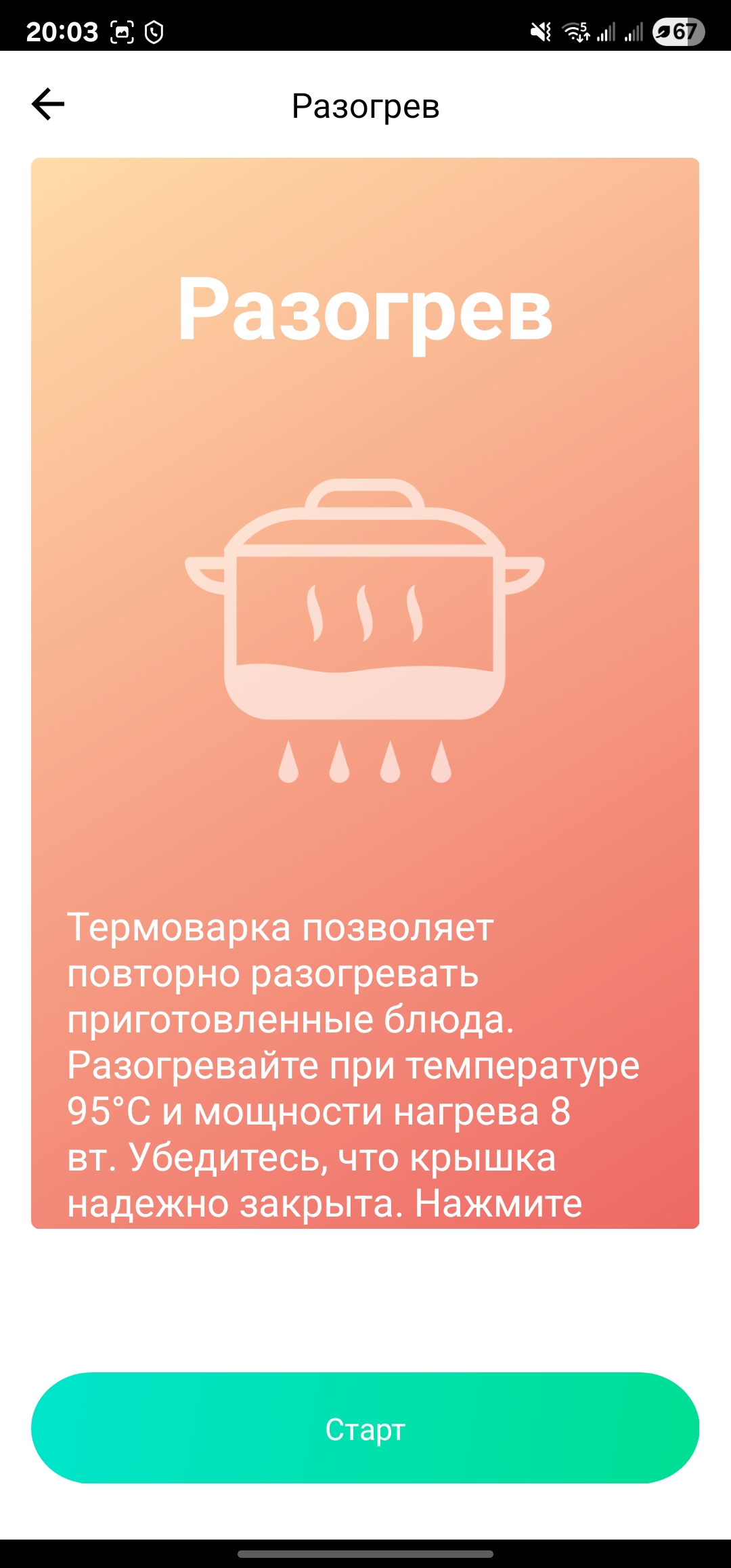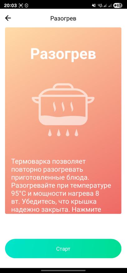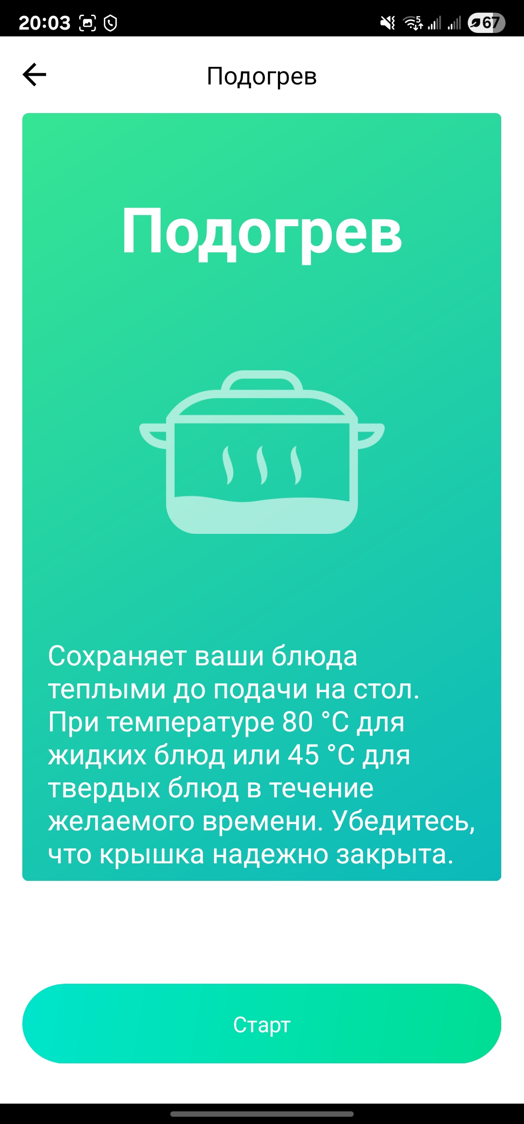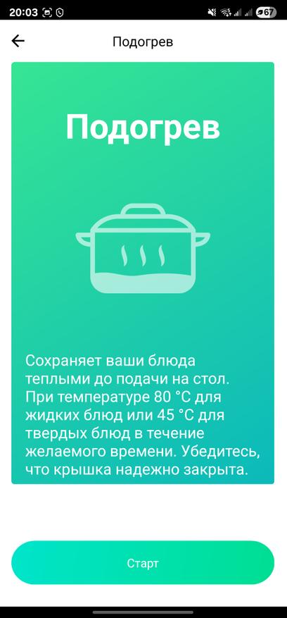 - подогрев (до 80 градусов) и разогрев (до 95 градусов),