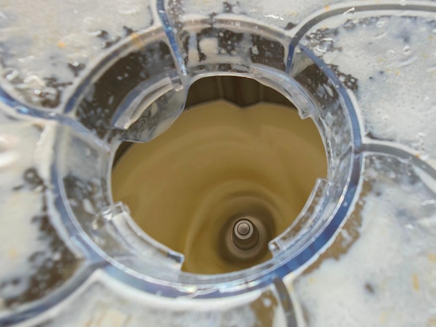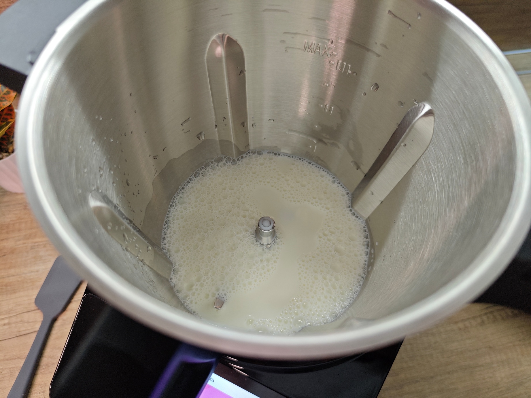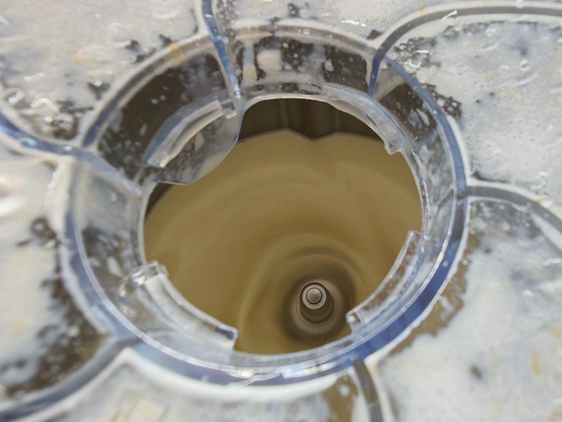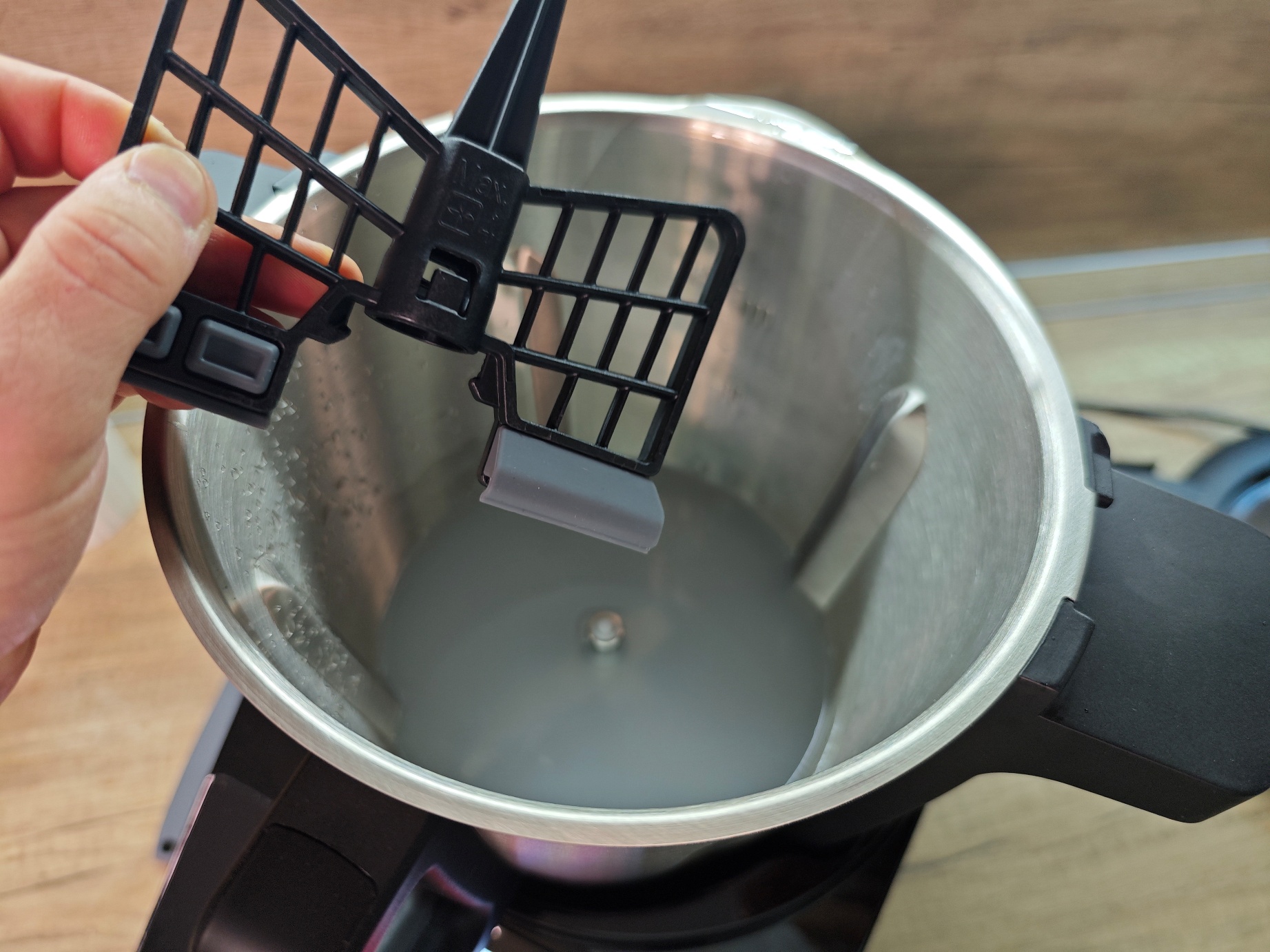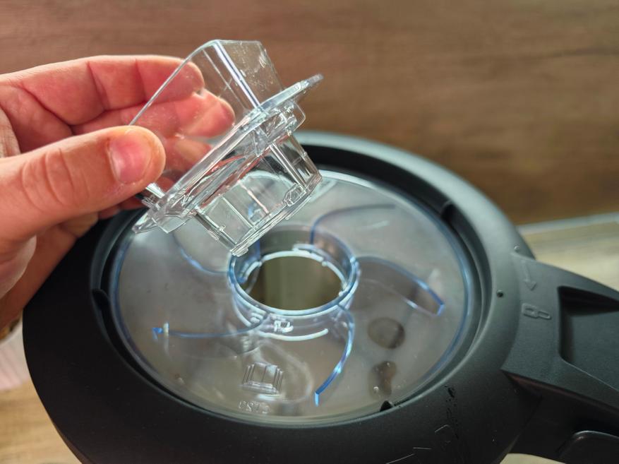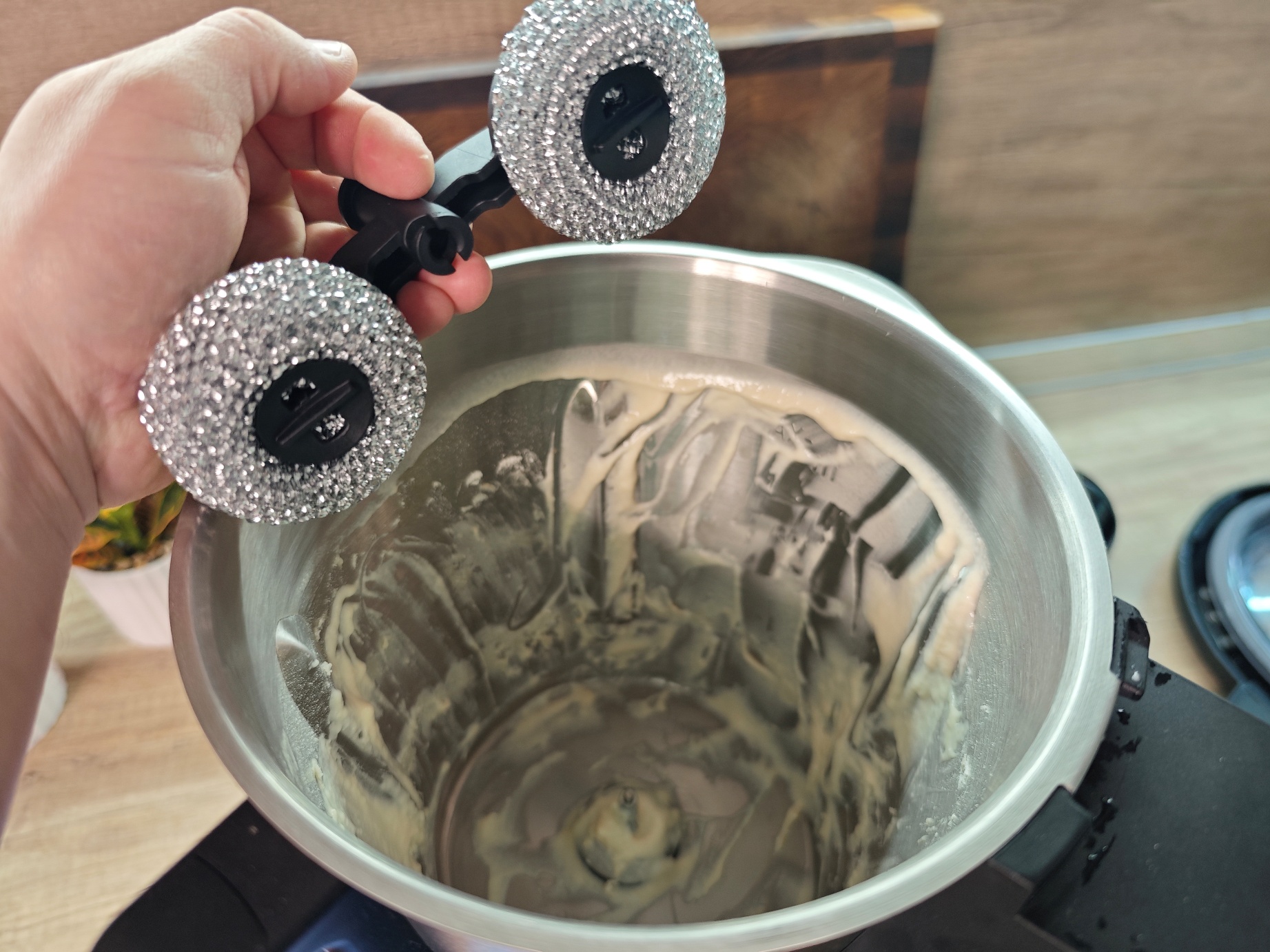 После приготовления йогуртов или коктейлей достаточно запустить режим простой самоочистки. Для этого сверху на насадку «Многофункциональный нож» устанавливаем пластиковую насадку-бабочку. Насадка оснащена двумя силиконовыми скребками для очистки дна, а вода в ёмкости подогревается в процессе до 70 градусов. Результат удивил — с одного раза все стало чистым, все следы от молока были удалены с поверхности. Можно слегка сполоснуть ёмкость и переходить к другому рецепту.