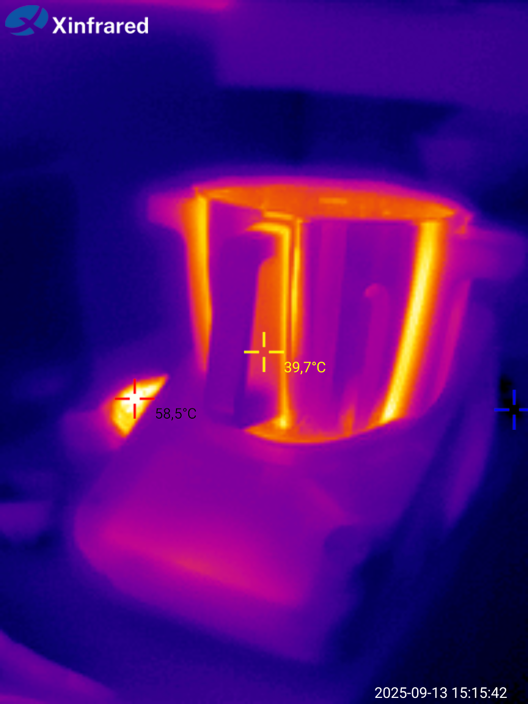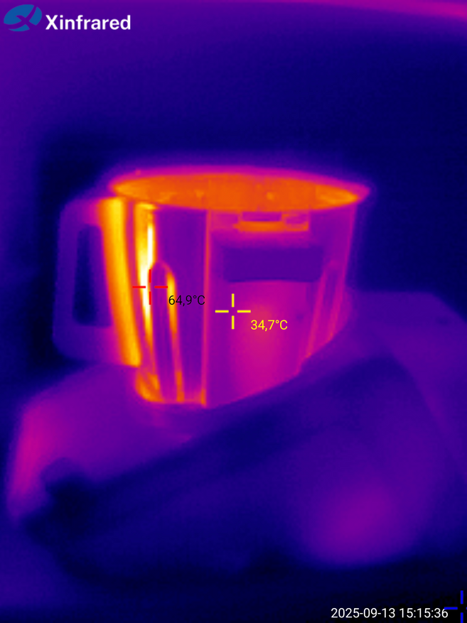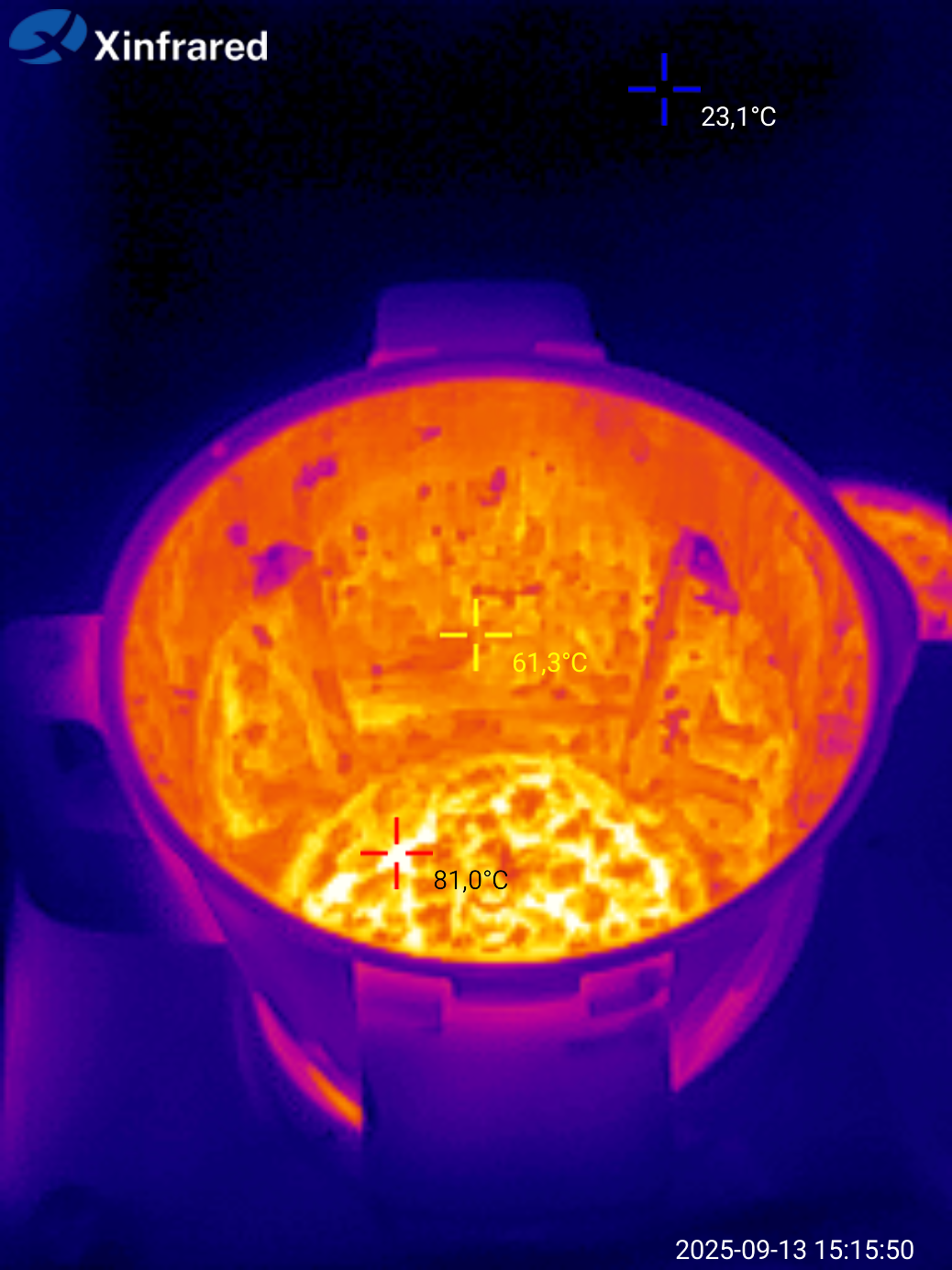 В тепловизоре картинка становится довольно зловещей — содержимое похоже на кипящую лаву. Температура будет зависеть от выставленных настроек, в данном случае — 80 градусов. В любом случае, основной нагрев приходится на стальную чашу, на ней, к слову, нанесены соответствующие знаки («осторожно, горячо!»).